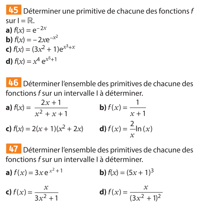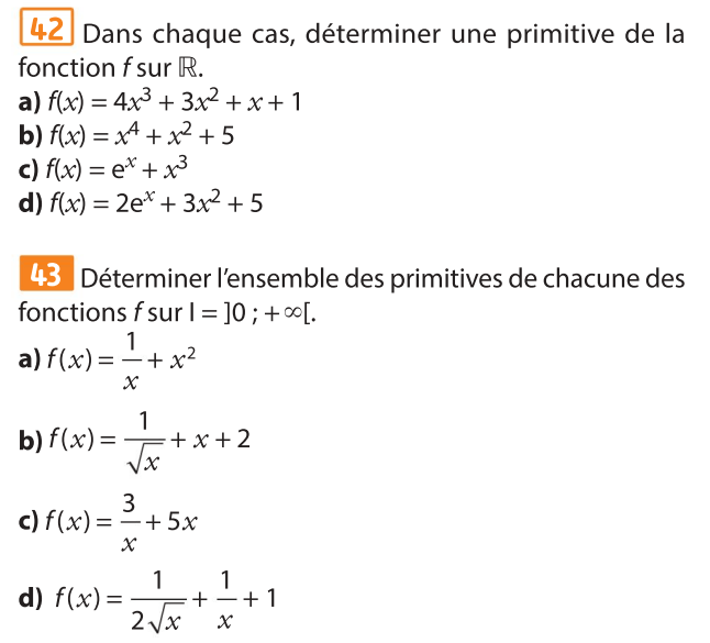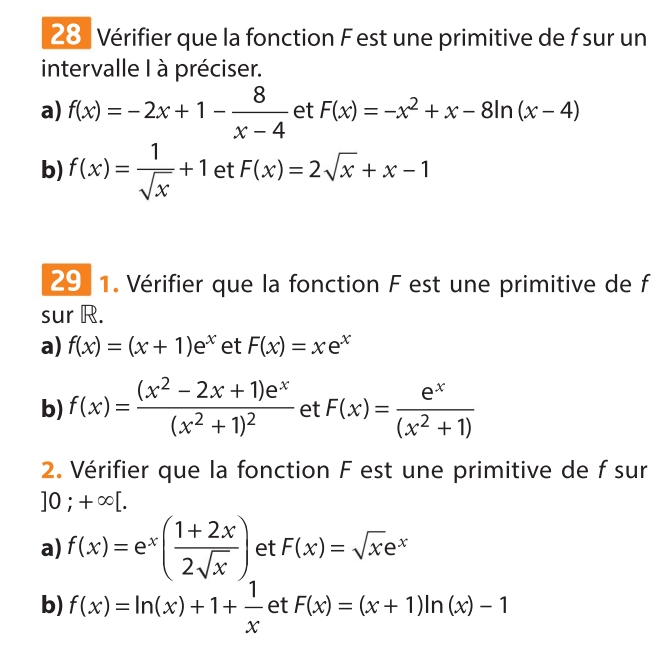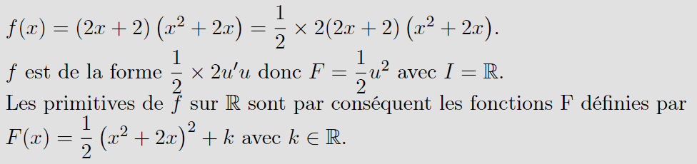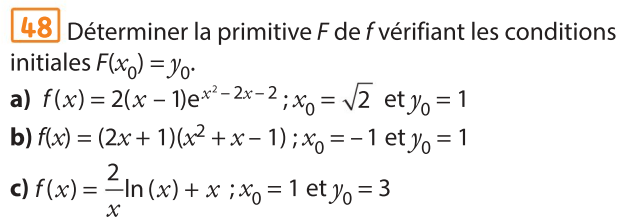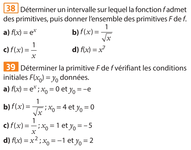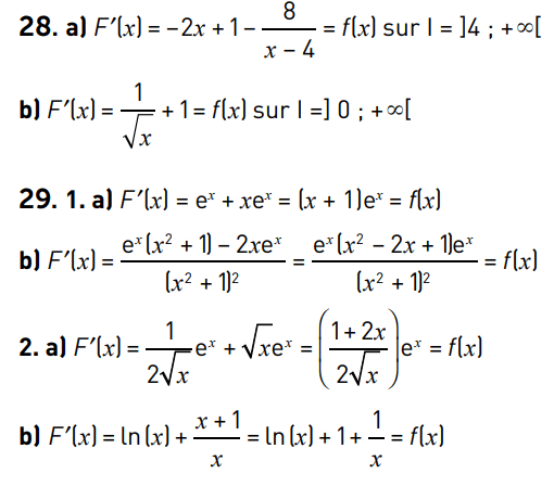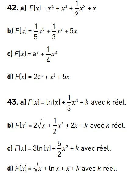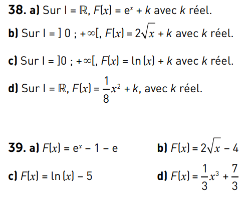 d)\;\text{Sur }I=\mathbb{R}, F(x) = \dfrac{1}{8}x^8+k\text{ avec }k \text{ réel.}