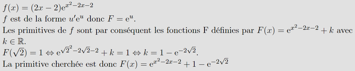 f= -\dfrac{1}{2}\times u'\text{e}^{u}\text{ donc }F=-\dfrac{1}{2}\times \text{e}^{u}.