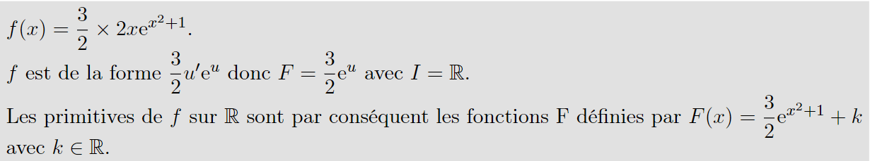 b)\,f=u'\text{e}^{u}\text{ donc }F=\text{e}^{u}.