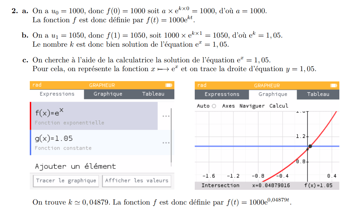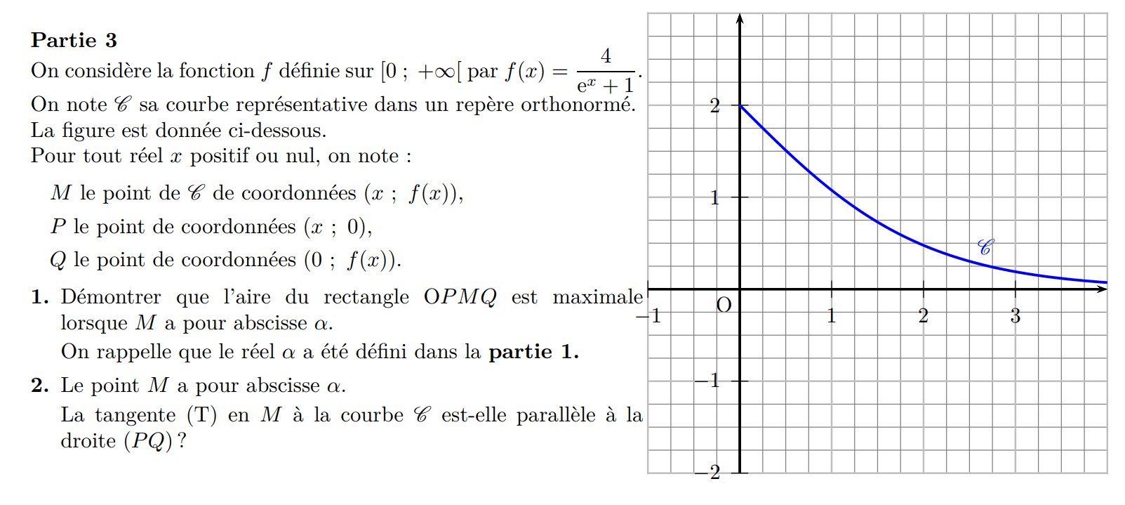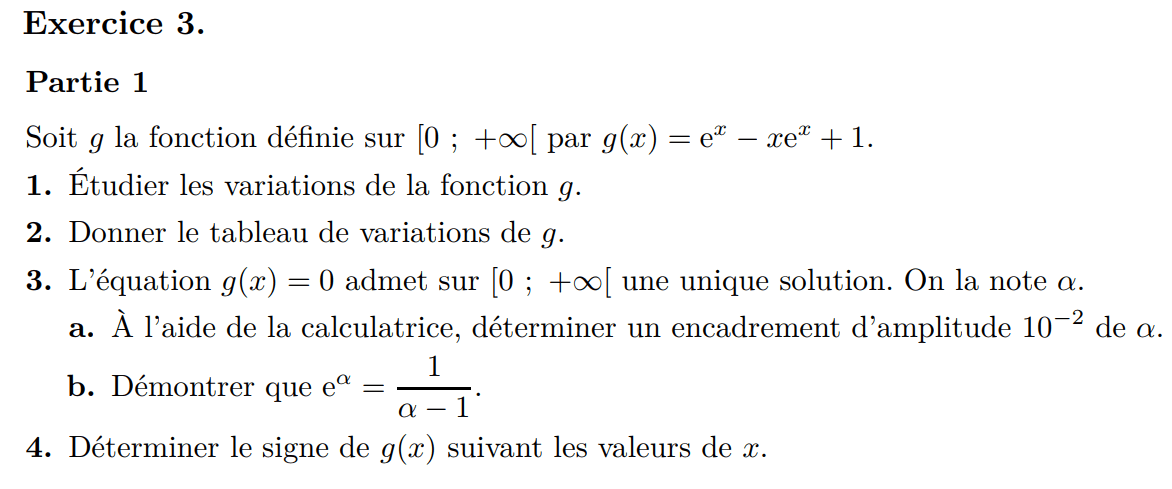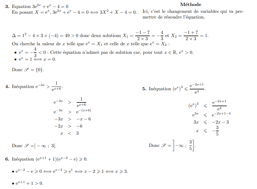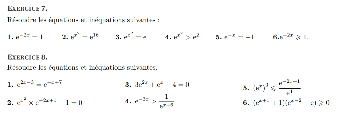 Fonction exponentielle : fonction \(f\) définie et dérivable sur \(\R\) qui vérifie pour tout nombre réel \(x\) :