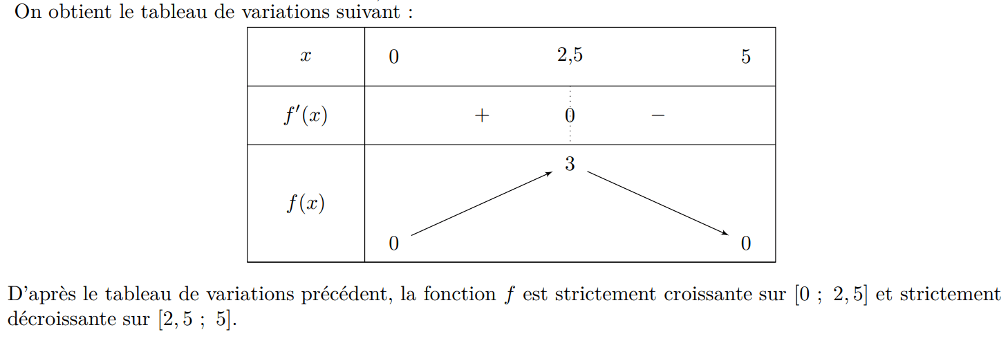 Règle du signe d'un trinôme : \(f'\) est négative \( (a = -1,5) \) à l'extérieur de ses racines. D'où le tableau de variations :