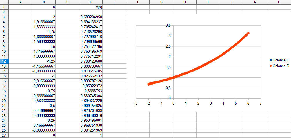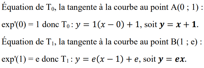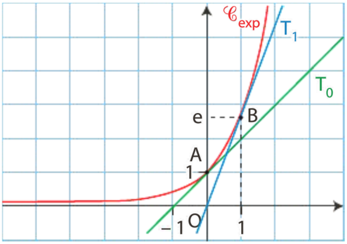 3. On peut alors construire la courbe représentative de la fonction exponentielle à l’aide d’un tableau de valeurs en remarquant que chaque résultat trouvé correspond non seulement à l’ordonnée du point de la courbe mais aussi au coefficient directeur de la tangente car (exp)'=exp.