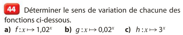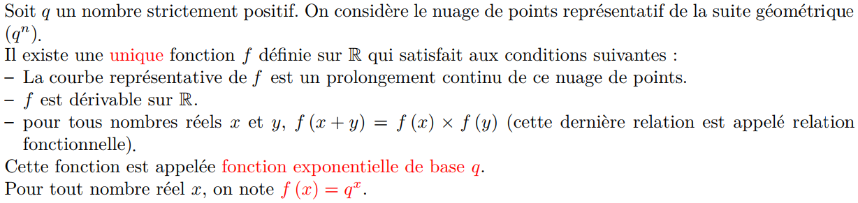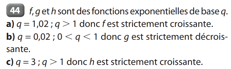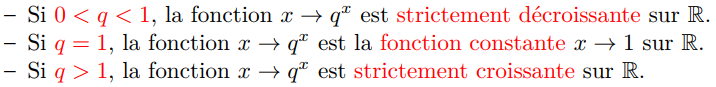Comme la fonction exponentielle de base q est un prolongement continu de la suite géométrique , son sens de variation est le même que celui de cette suite :