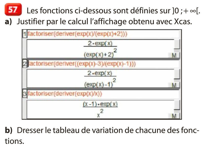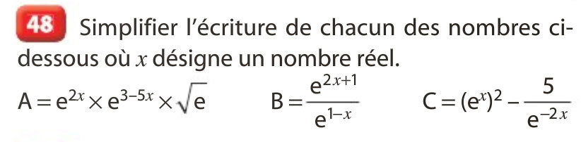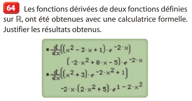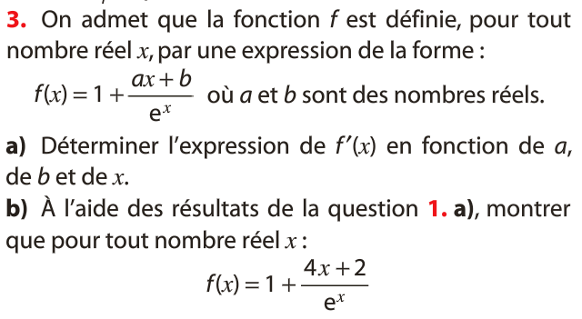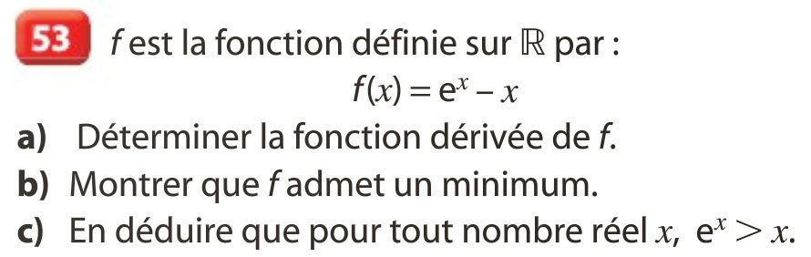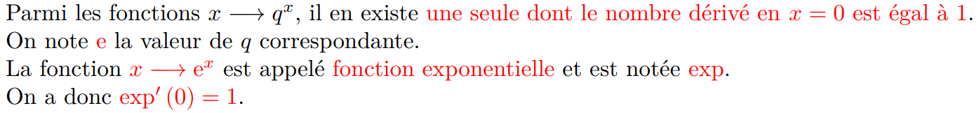Alors la fonction f définie sur I par \(f(x) = e^{u(x)}\) est dérivable sur I et : \(f'(x) = u'(x)e^{u(x)}\)