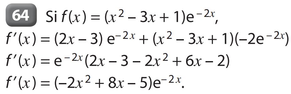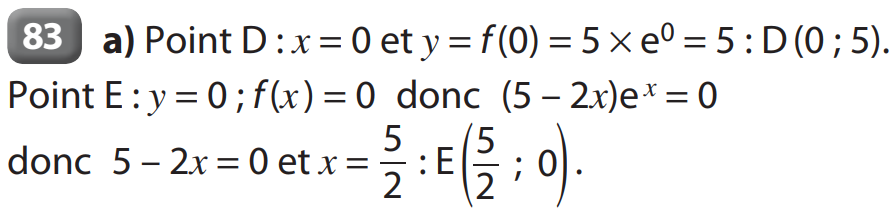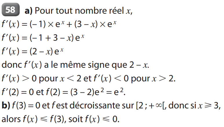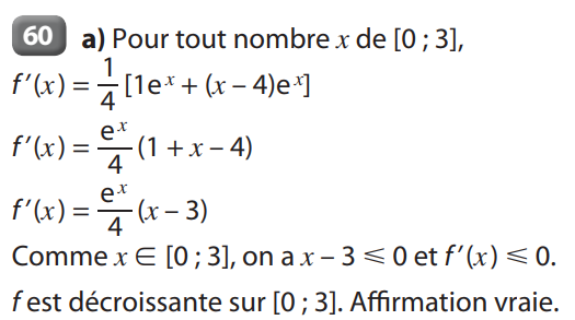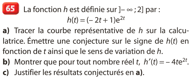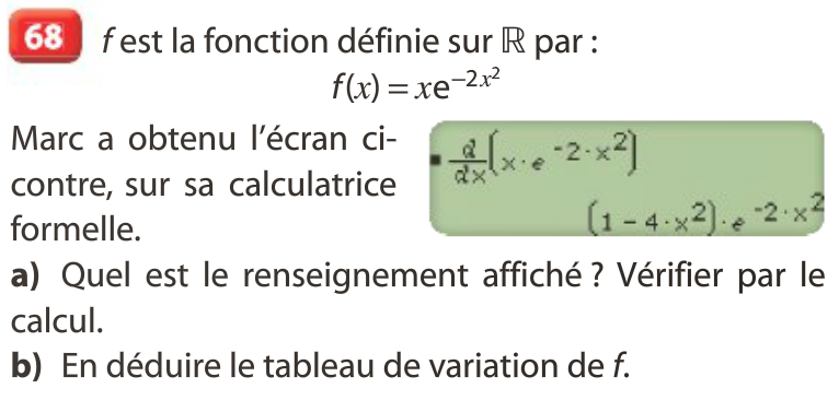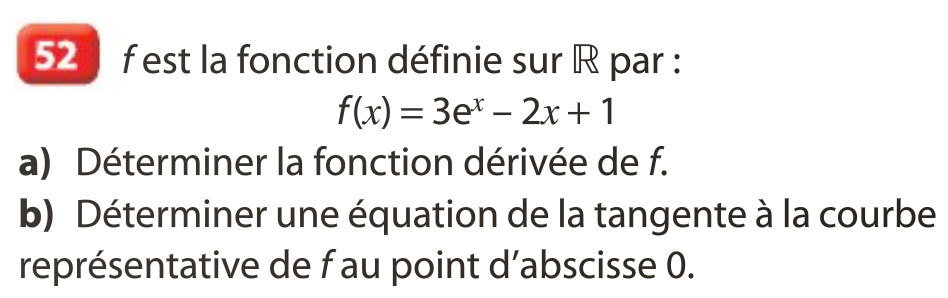 a) f est de la forme uv avec \(u(x)=3x-1\) et \(v(x)=e^{-2x}\).