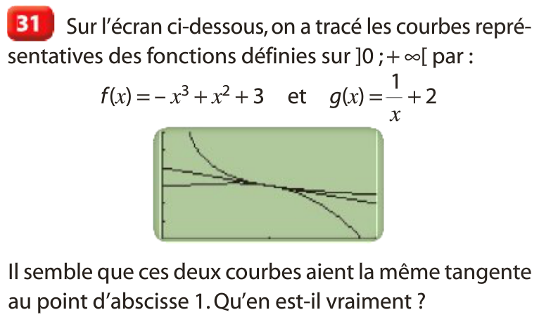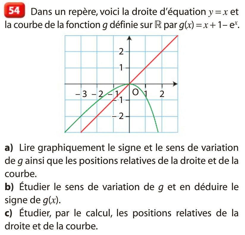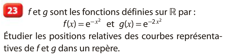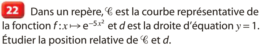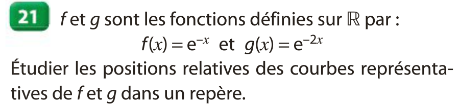 Méthode : Pour étudier les positions relatives de deux courbes Cf et Cg, on étudie le signe de \( f - g \) ou si les fonctions sont strictement positives on compare le quotient \( \frac{f}{g} \) à 1.