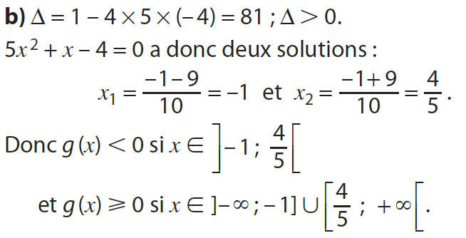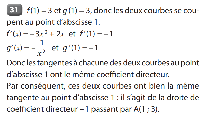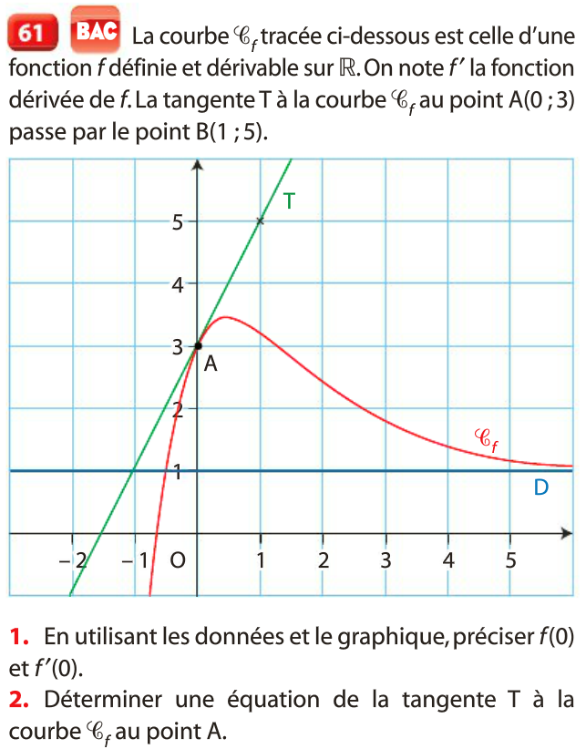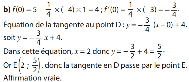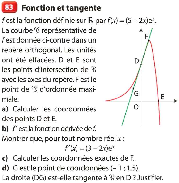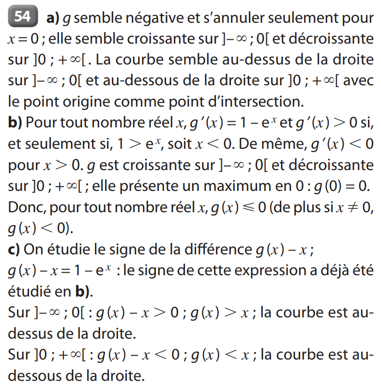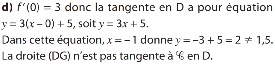 Or pour tout réel x on a \( -5x^2 \leq 0\) donc la courbe C reste en dessous de la droite avec un point de contact : J (0 ; 1)