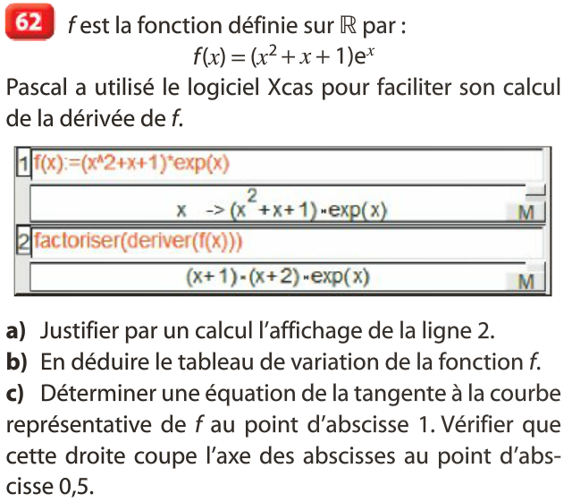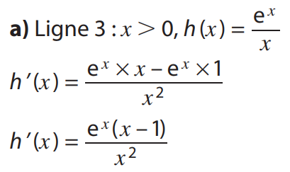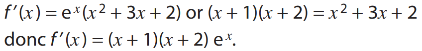 Calcul de la dérivée : f est de la forme uv avec \(u(x)=x\) et \(v(x)=e^x\).