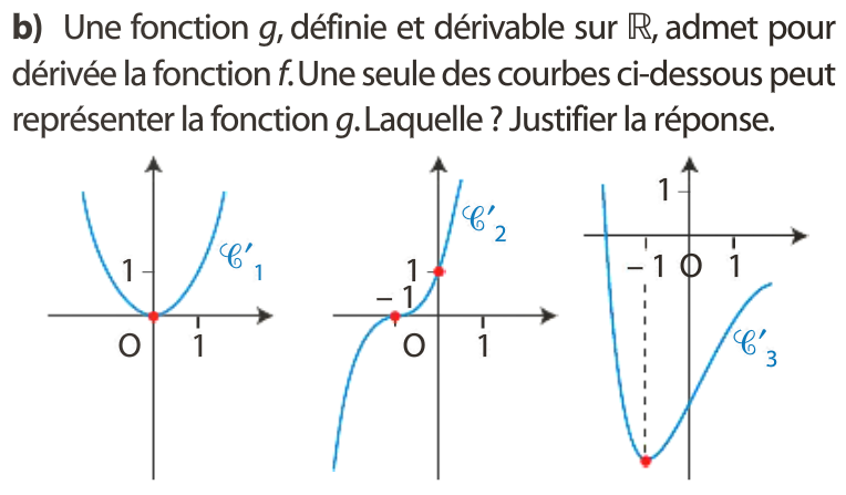 f est négative sur ]–∞ ; –1] et positive sur ]–1 ; +∞[. Donc si f = g’ alors g est décroissante sur ]–∞ ; – 1] et croissante sur ]–1 ; +∞[. Seule la courbe C’3 peut représenter g.