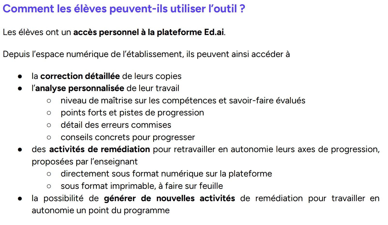 Assistant numérique basé sur l'IA qui accompagne le travail des enseignants, notamment en matière de correction et de remédiation pédagogique.