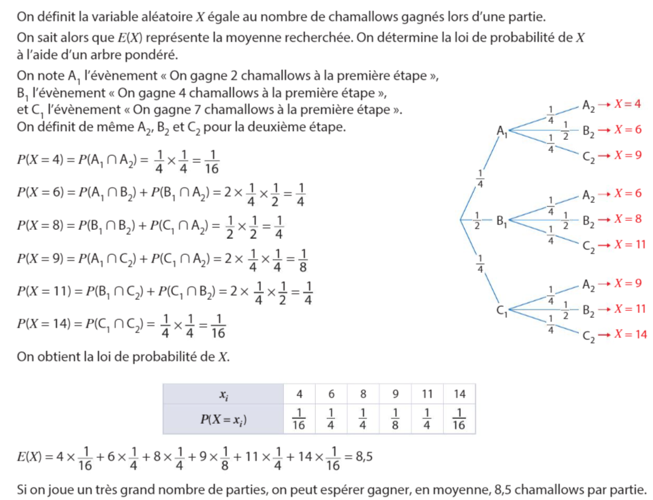- Pour obtenir l’espérance, on calcule la moyenne des valeurs xi pondérées par les probabilités pi.