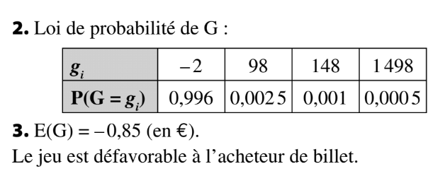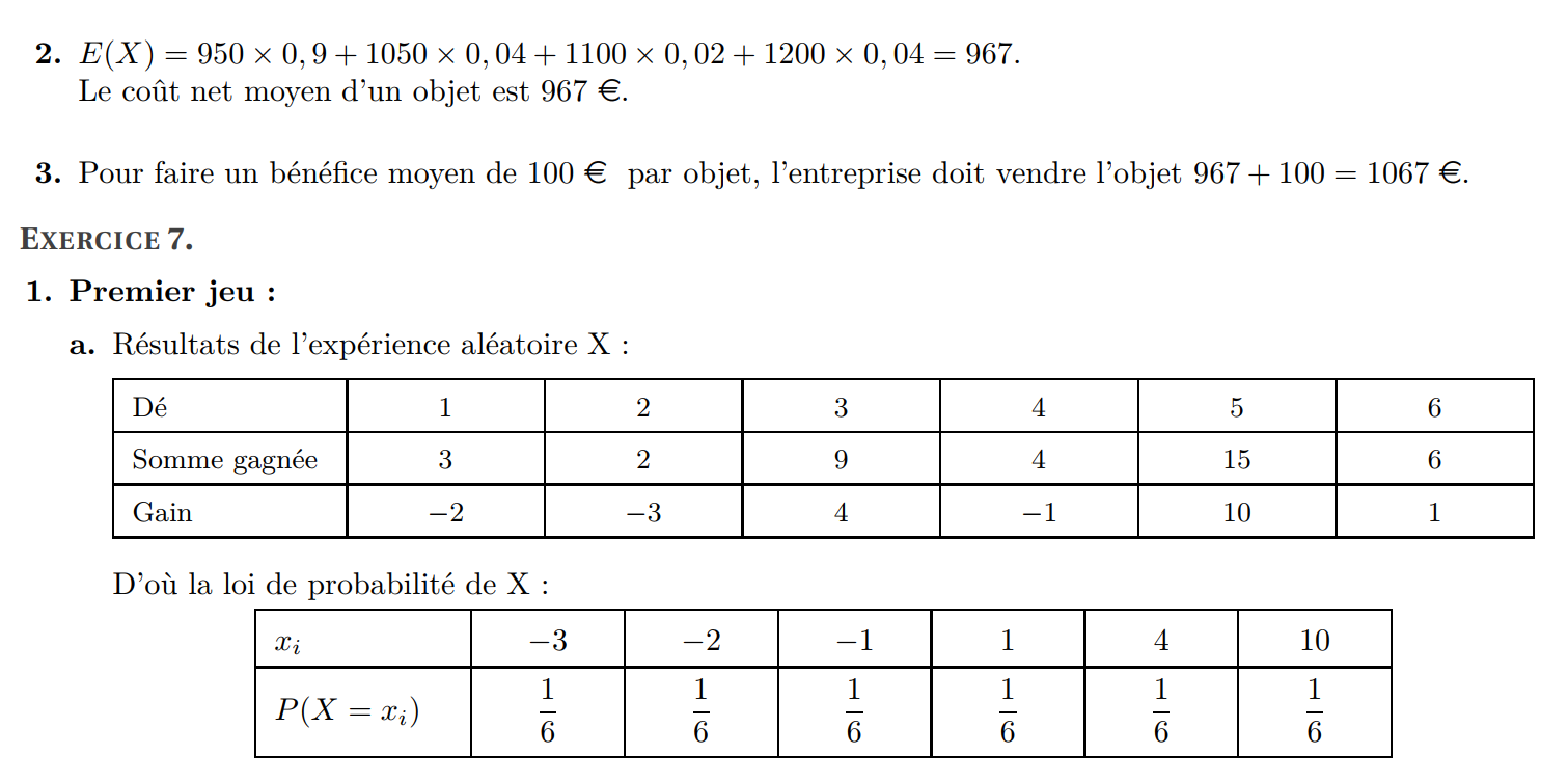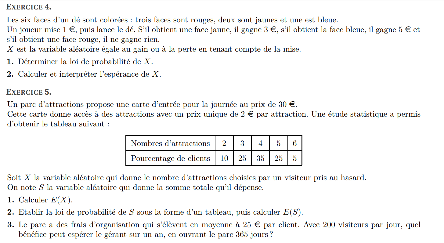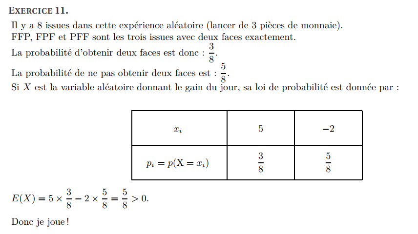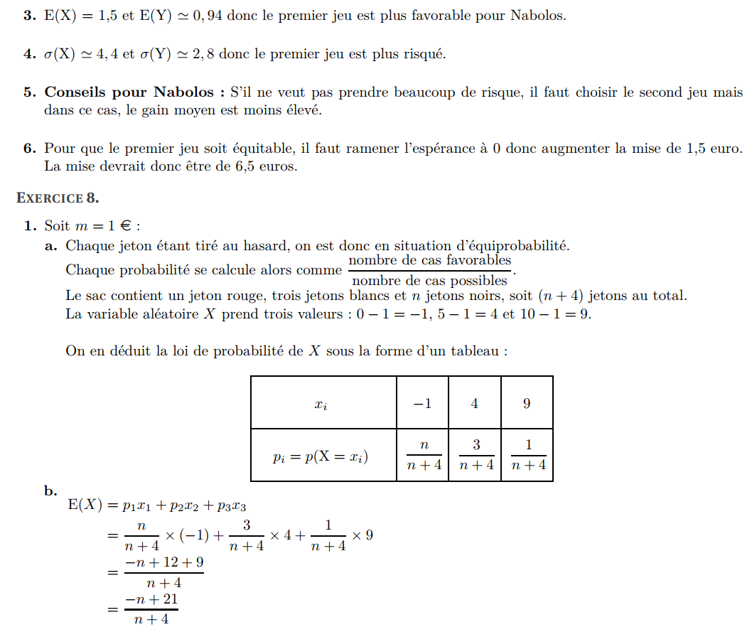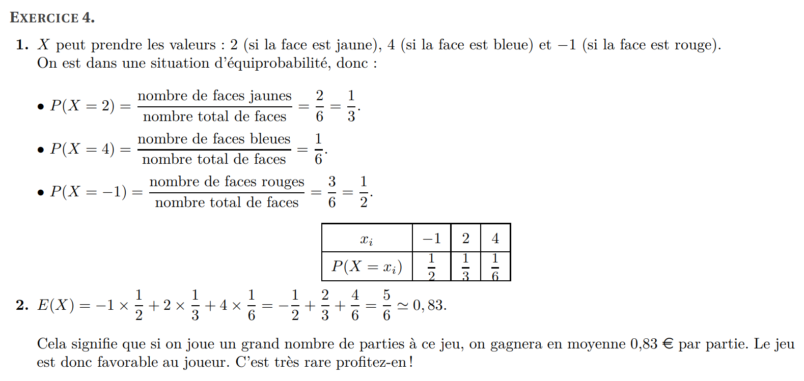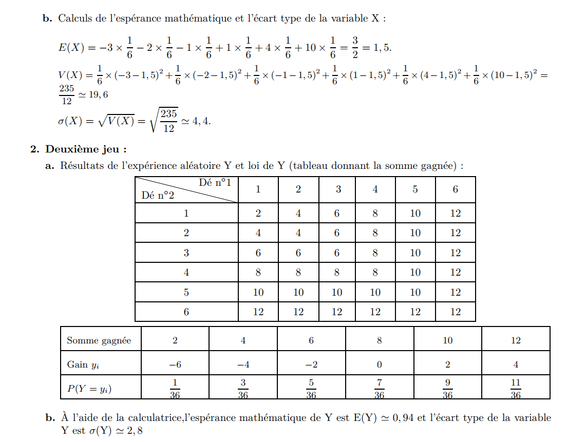 - Dans le deuxième exemple du 3.1 : E(X) > 0 donc ce jeu est favorable au joueur.