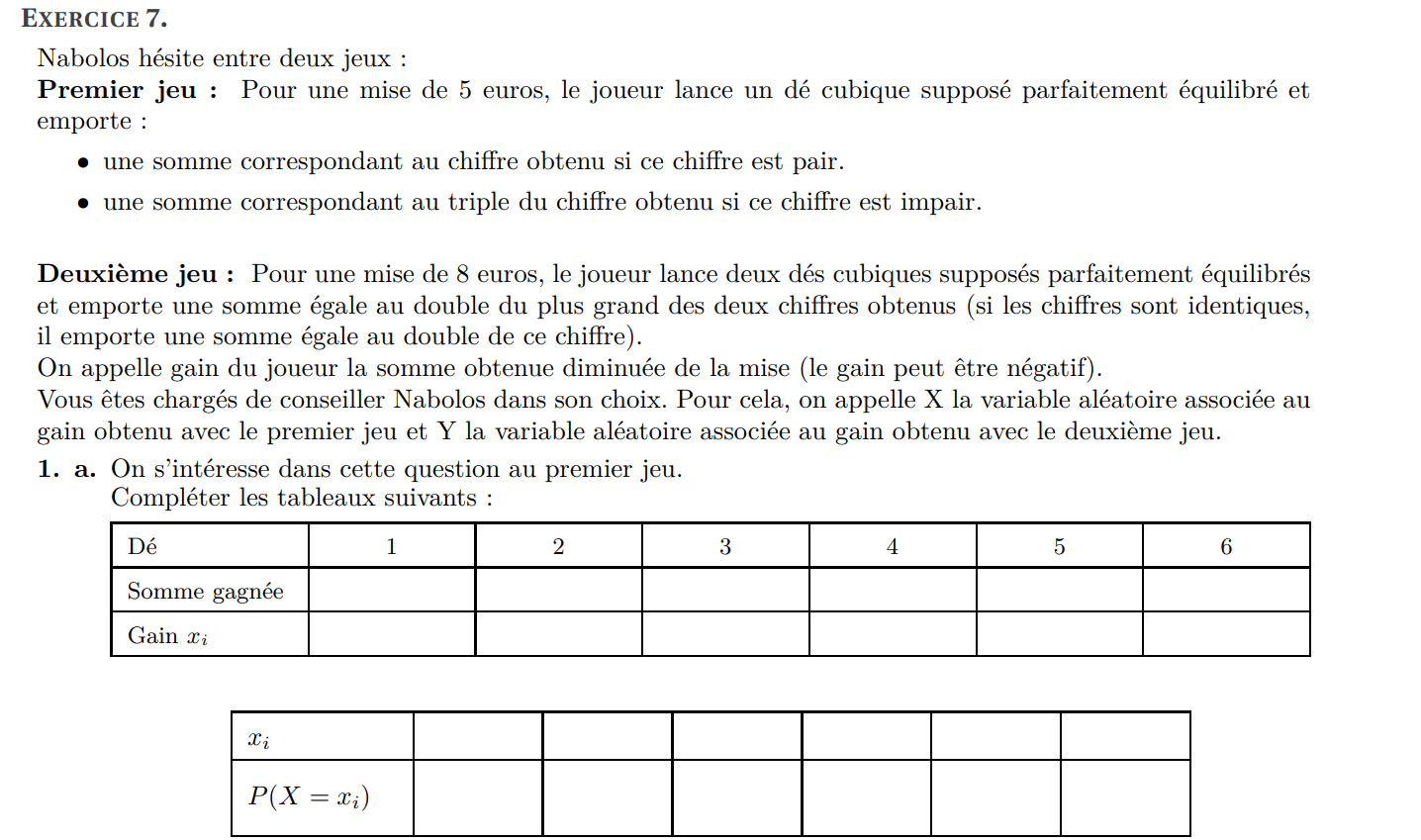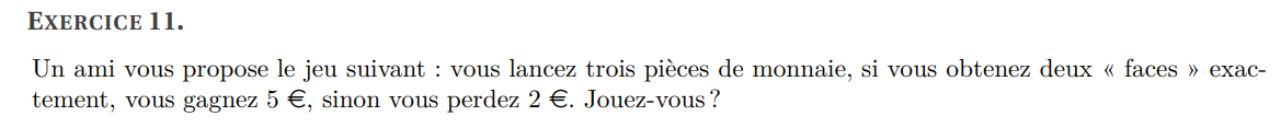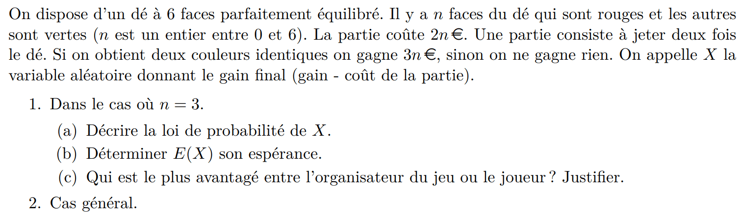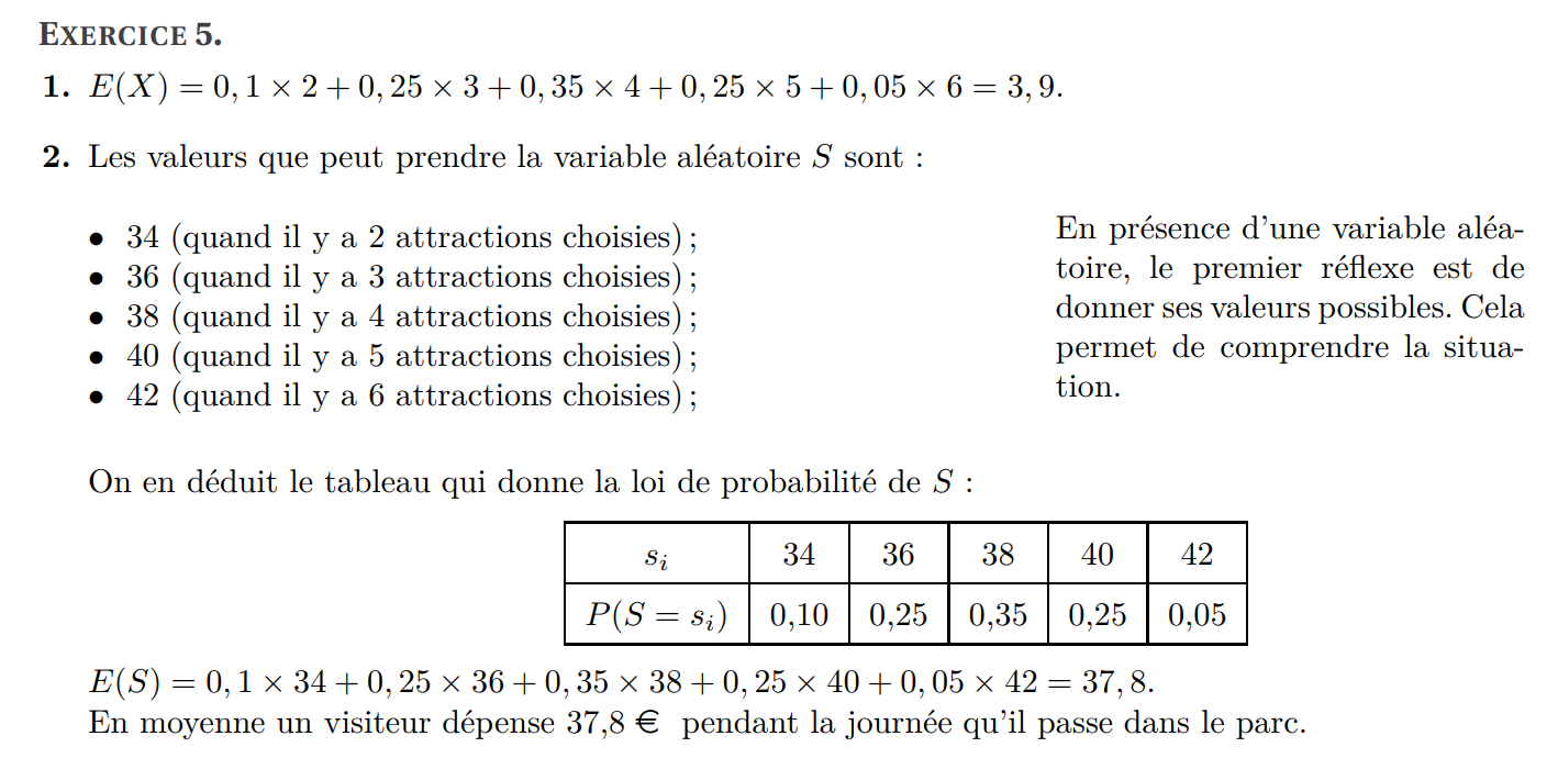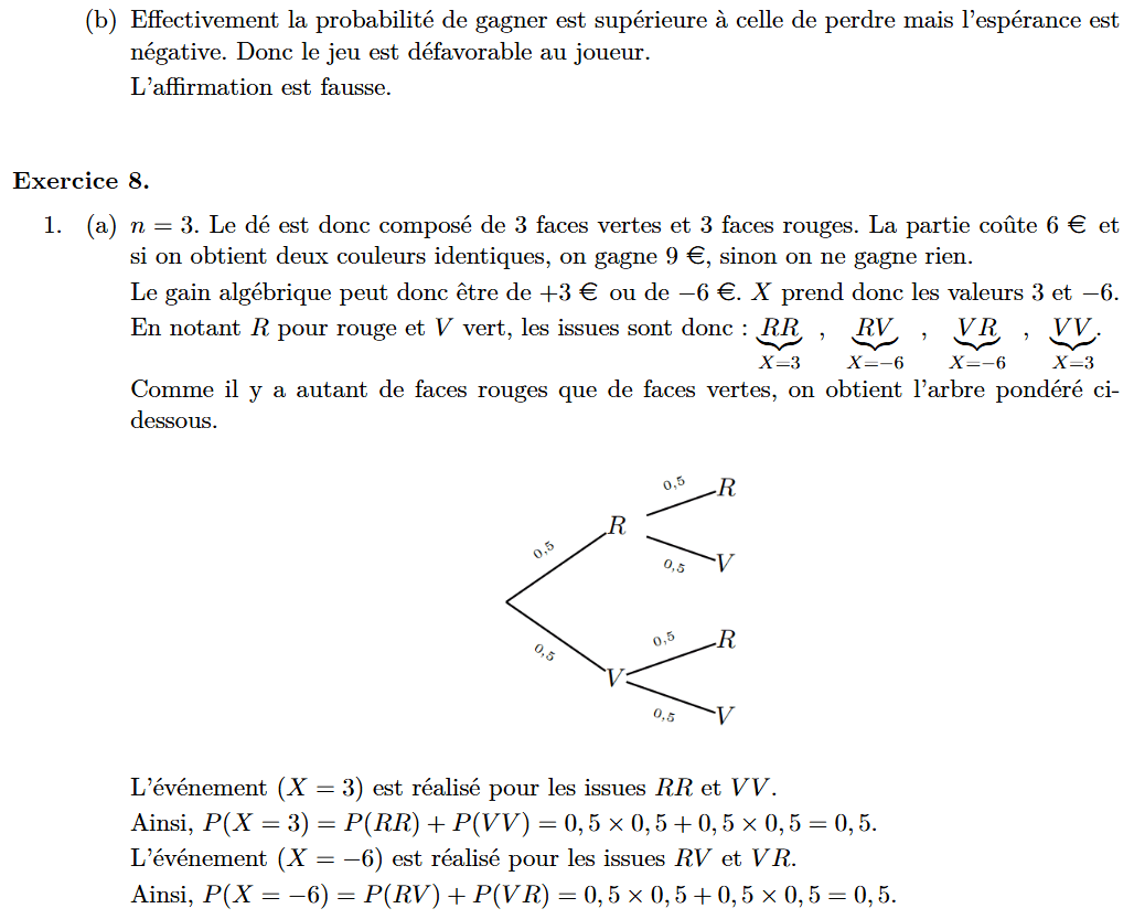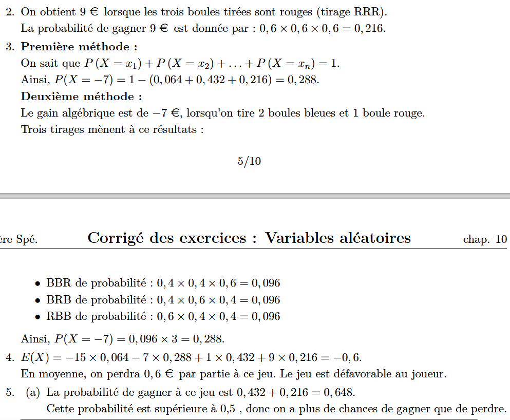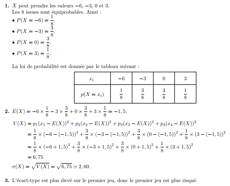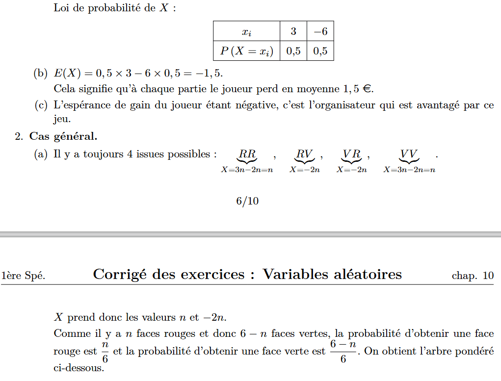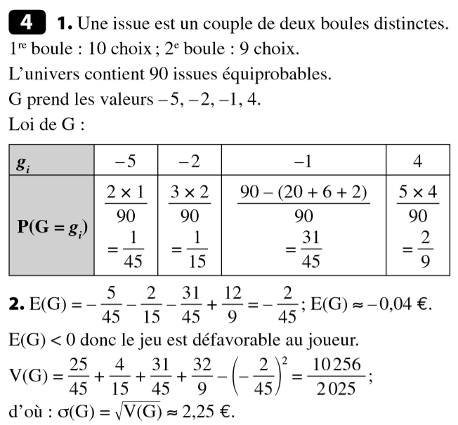 - Dans le deuxième exemple du 3.1 : E(X) > 0 donc ce jeu est favorable au joueur.