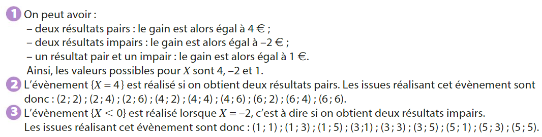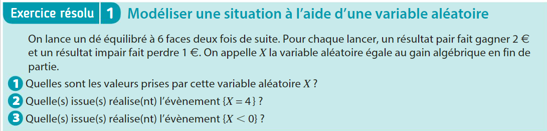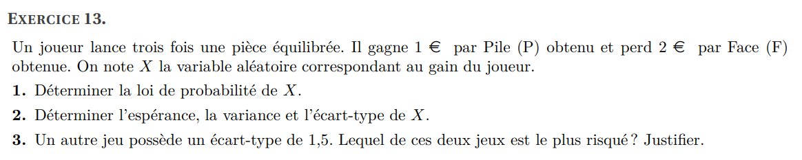On gagne 1 € chaque fois que F apparaît et on perd 1 € chaque fois que P apparaît. On note X la fonction qui, à chaque issue, associe le gain algébrique (positif ou négatif) correspondant.