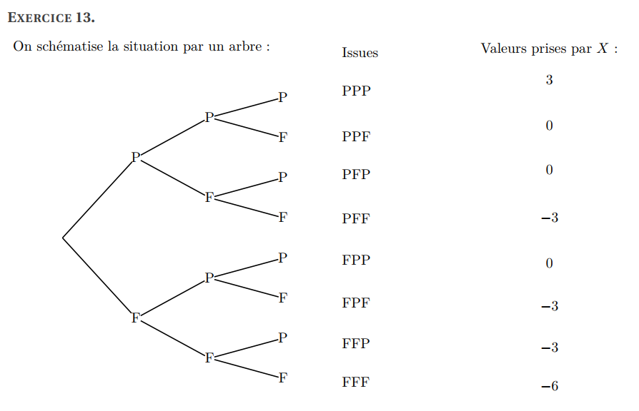 - L’événement X = −3 est {PPP}. Sa probabilité est p (X = −3) =