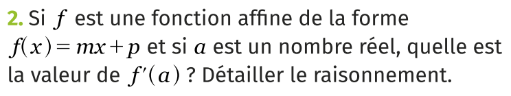 Soit f une fonction de la forme \(f(x) = mx+p\). La courbe représentative de f est une droite car f est une fonction affine. Par conséquent, la tangente au point d’abscisse a est confondue avec la courbe représentative de f , qui est donc une droite, et \(f'(a)\) correspond à son coefficient directeur. Ce coefficient directeur vaut m et ainsi \(f'(a) = m\).