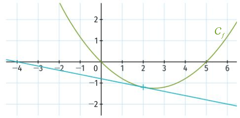 \(f'(x)=-0,2\) donc l'équation de la tangente à la courbe \(C_f\) au point d'abscisse 2 est de la forme \(y=-0,2x+p\).