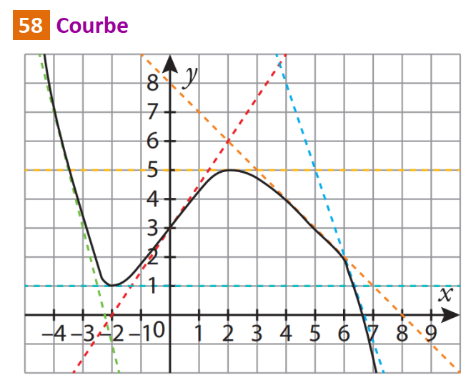 La droite jaune est la tangente à la courbe représentative de \(f\) au point d’abscisse 4.
