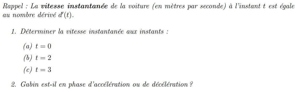 3. Lorsqu’une fonction f modélise la position en fonction du temps d’un mobile animé d’un mouvement rectiligne, que représente \(f'(a)\) ?