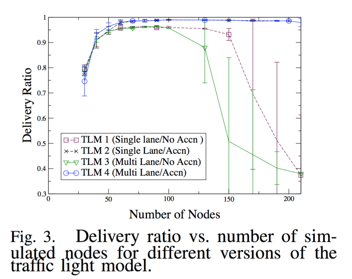- The simulation of multiple lanes and coordinated traffic lights has only a marginal impact on the ad hoc routing performance.