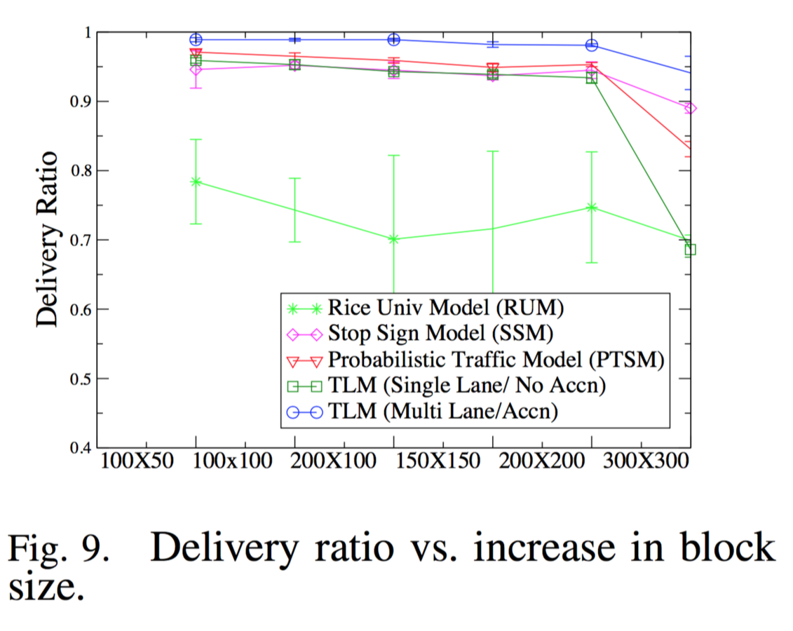 - The clustering effect of vehicles waiting at intersections and acceleration/deceleration of vehicles are significant factors that affect the delivery ratio and packet delays in VANETs.
