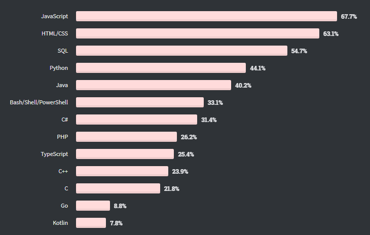 Gráfico de linguagens mais usadas segundo pesquisa do StackOverflow realizada em 2020