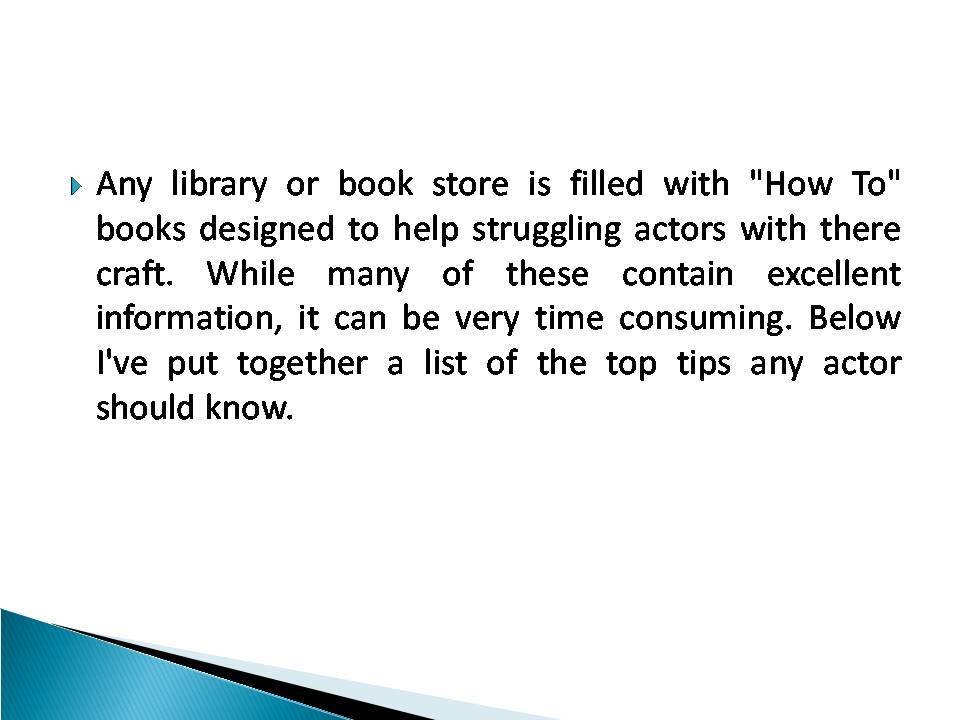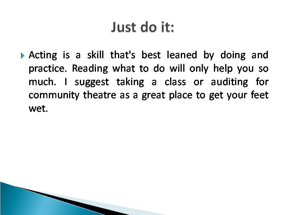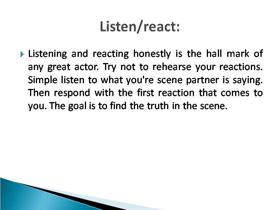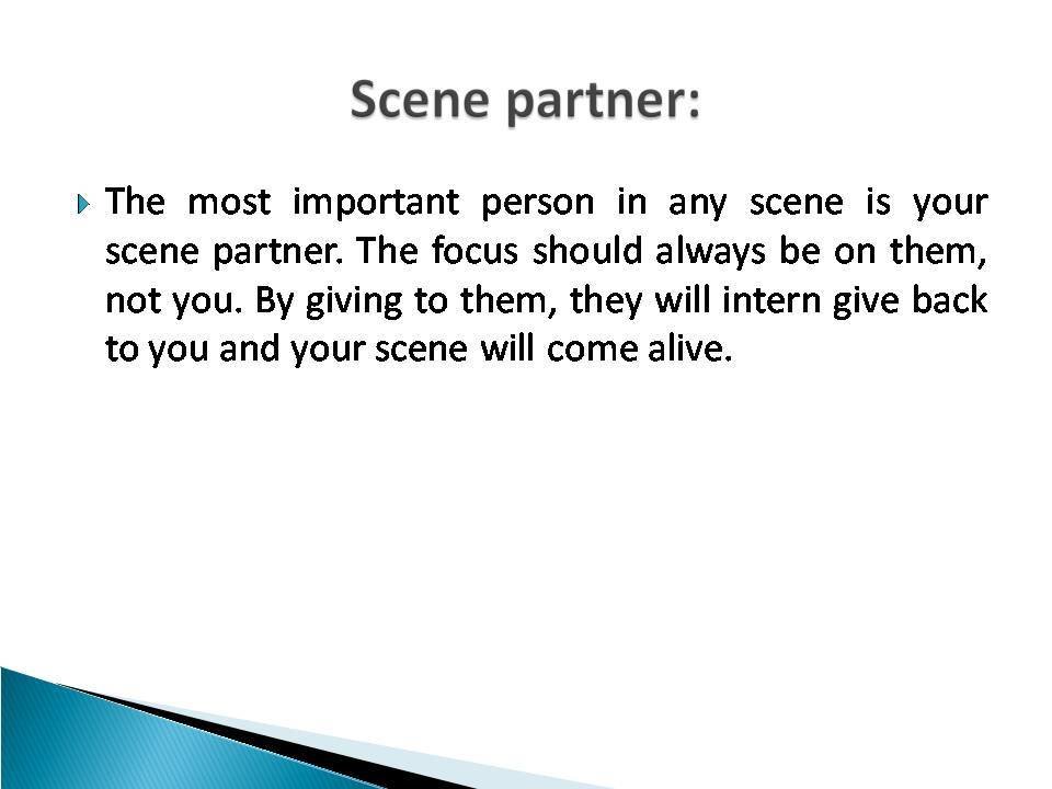The most important person in any scene is your scene partner. The focus should always be on them, not you. By giving to them, they will intern give back to you and your scene will come alive.