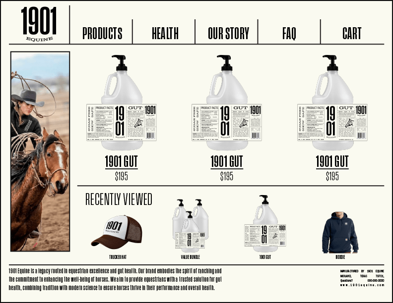 1901 Equine is a legacy rooted in equestrian excellence and gut health. Our brand embodies the spirit of ranching and the commitment to enhancing the well-being of horses. We aim to provide equestrians with a trusted solution for gut health, combining tradition with modern science to ensure horses thrive in their performance and overall health.