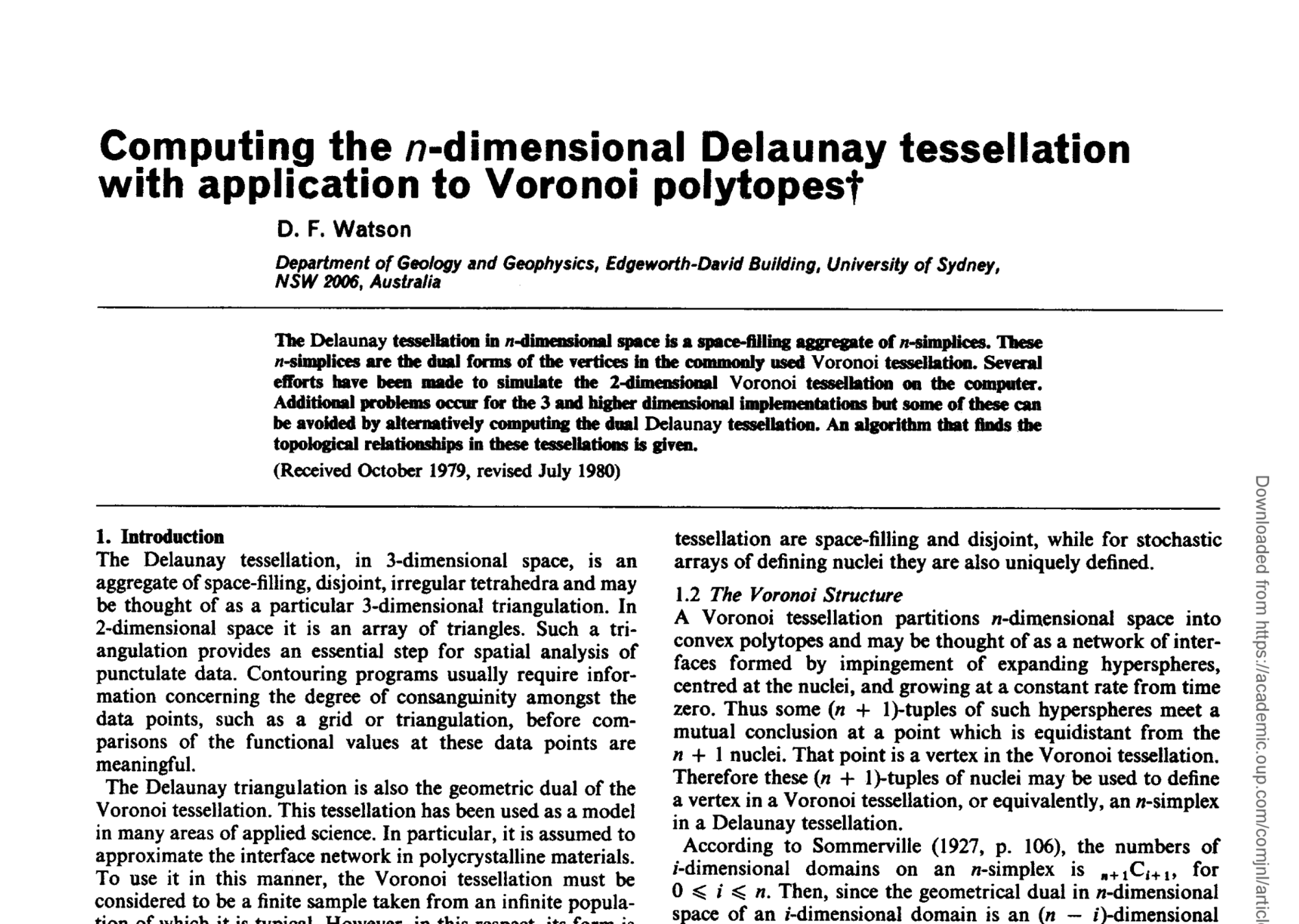 - D. F. Watson: Computing the n-Dimensional Delaunay Tesselation with Application to Voronoi Polytopes. page 167-172