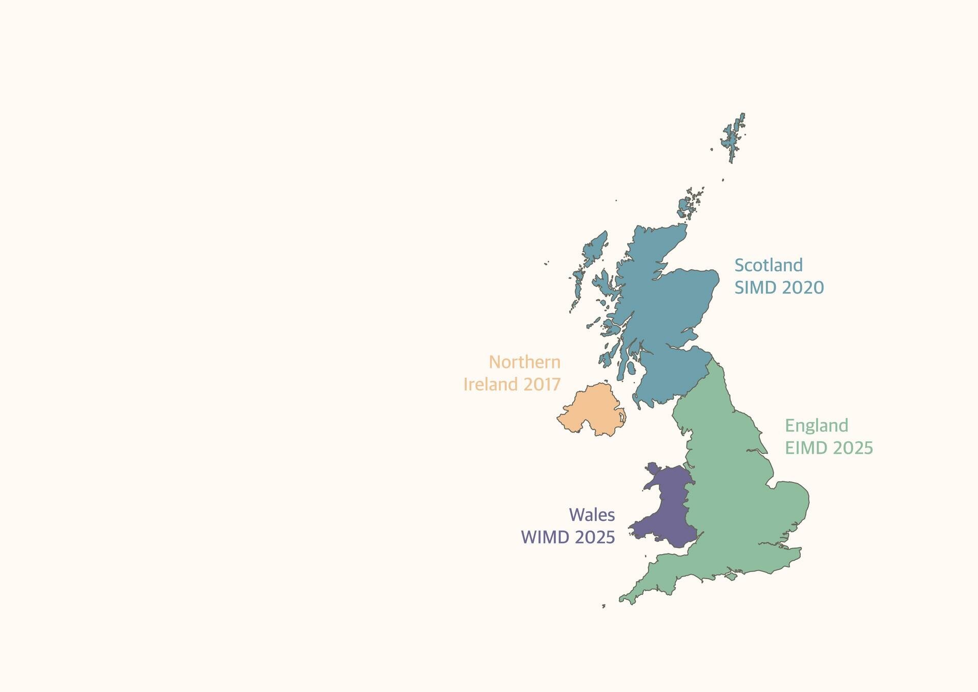 - Scottish Index of Multiple Deprivation (SIMD), Northern Irish Multiple Deprivation Measure (NIMDM), English Index of Multiple Deprivation (EIMD), and Welsh Index of Multiple Deprivation (WIMD)