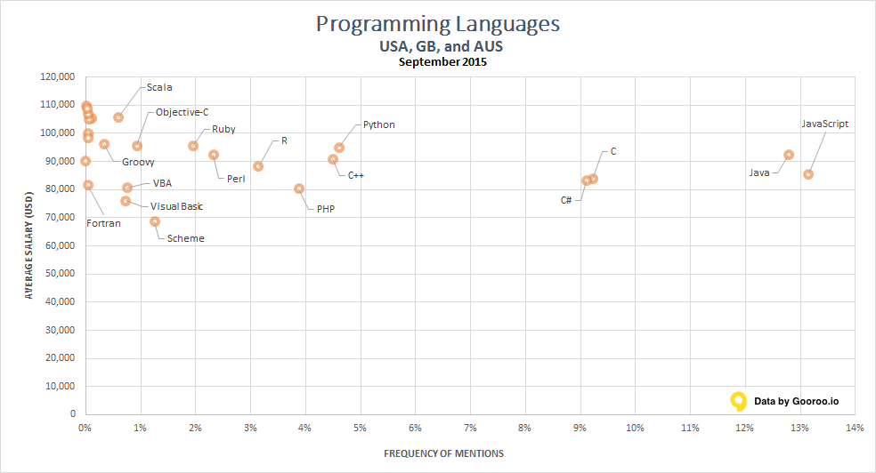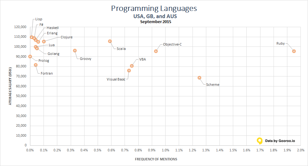 Lenguajes de programación por salario y popularidad, (septiembre 2015)