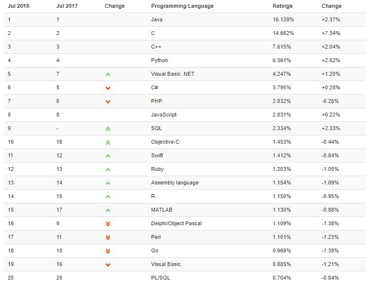 Lenguajes de programación según su popularidad (julio 2018)