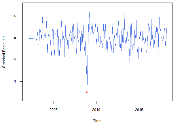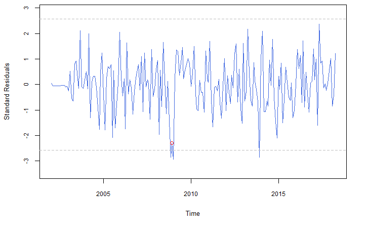 year = 2008 ,frequency = 12)Imagem: Gráfico dos resíduos do modelo