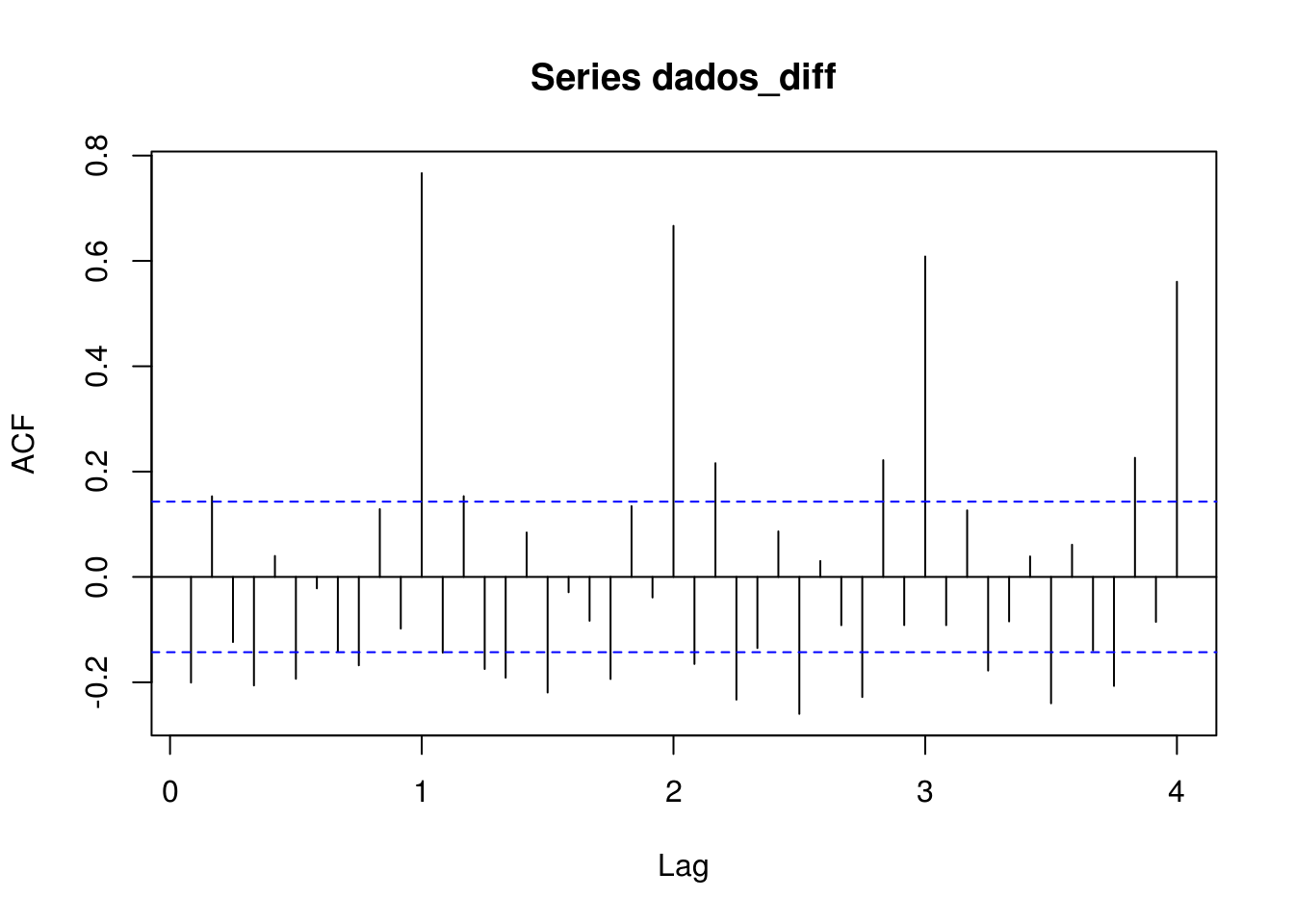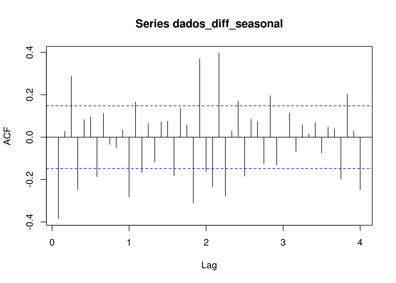 Podemos identificar uma ordem 2 para parte MA não sazonal e ordem 1 para a parte sazonal