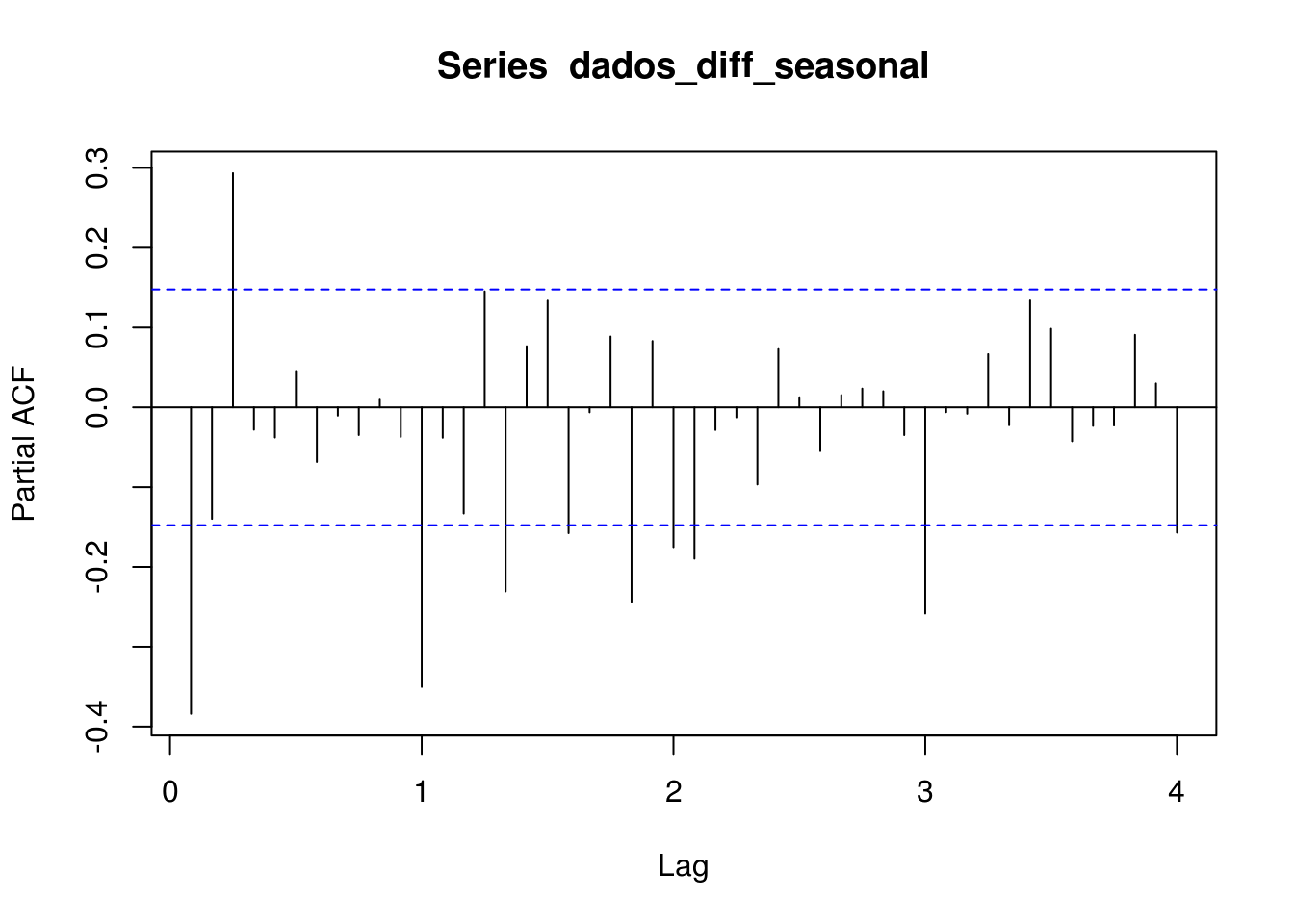 Ordem 3 para a parte AR não sazonal e ordem 1 para a parte sazonal.