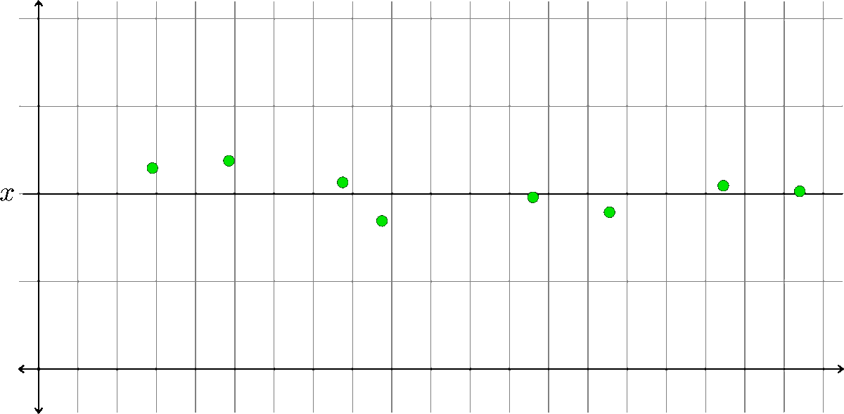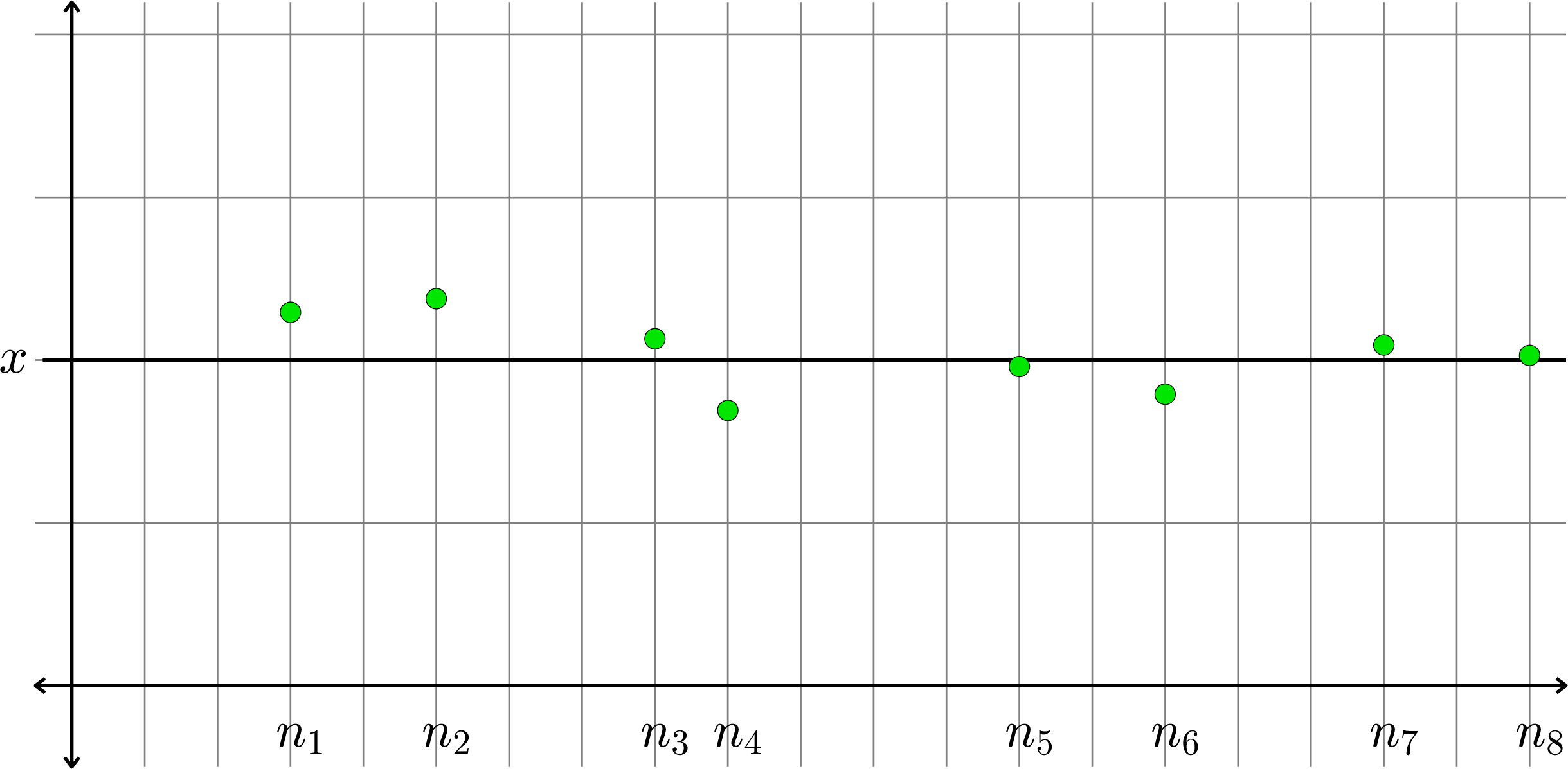 Consider a sequence \(X = (x_{n})\), graphed below in red, with limit \(x.\)