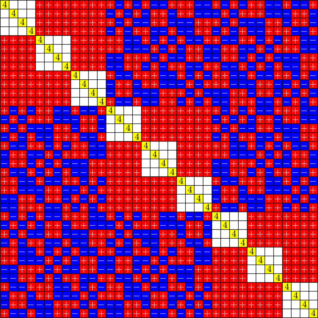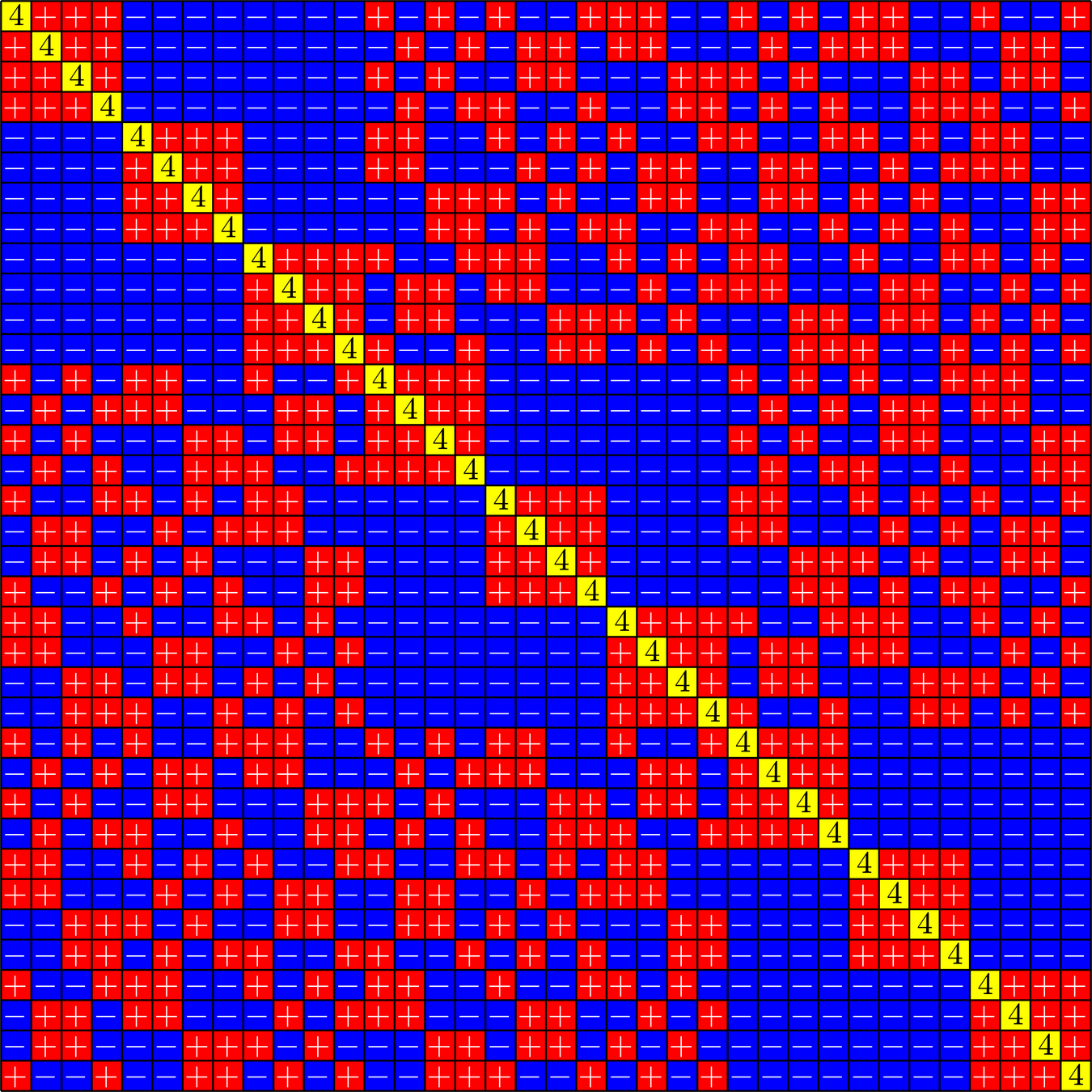 \[\left[\begin{array}{rrrr} 1 & 1 & 1 & 1\\ 1 & -1 & 1 & -1\\ 1 & 1 & -1 & -1\\ 1 & -1 & -1 & 1\end{array}\right]\]
