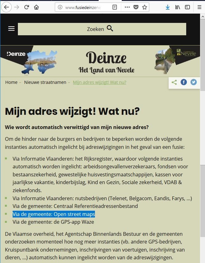 https://www.pajot-zenne.be/sites/default/files/documenten/Pajot%20Zenne%20magazine%20zomer%202018.pdf http://www.fusiedeinzenevele.be/adreswijziging https://riot.im/app/#/room/#osmbe:matrix.org/ https://github.com/osmbe/community_planning/issues/2 https://www.mapcontrib.xyz/t/2d975c-Geplande_adreswijzigingen_gemeentefusies https://help.openstreetmap.org/questions/66446/overpass-query-addresses-near-a-street-with-the-same-name-and-a-special-tag https://tools.geofabrik.de/mc/#17/50.8659/4.3492&num=3&mt0=mapnik&mt1=google-map&mt2=here-map