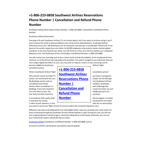 Southwest Airlines Reservations Phone Number +1-806-223-0858 | Cancellation and Refund Phone Number Southwest Airlines Reservation Planning to fly with Southwest Airlines? It's an honest option, but if you want to continue using it, you'll want to know the check-in and cancellation rules set by airline administrations. Southwest Airlines effectively serves over 100 destinations on all continents and operates a considerable 700 aircraft. It has become the world's largest low-cost airline. Its 60,000 employees help aviation teams maintain global standards. If you have booked your ticket, you will check in online up to 24 hours before your scheduled departure time. Call Southwest Airlines Cancellation and Refund Numbers +1-806-223-0858.
