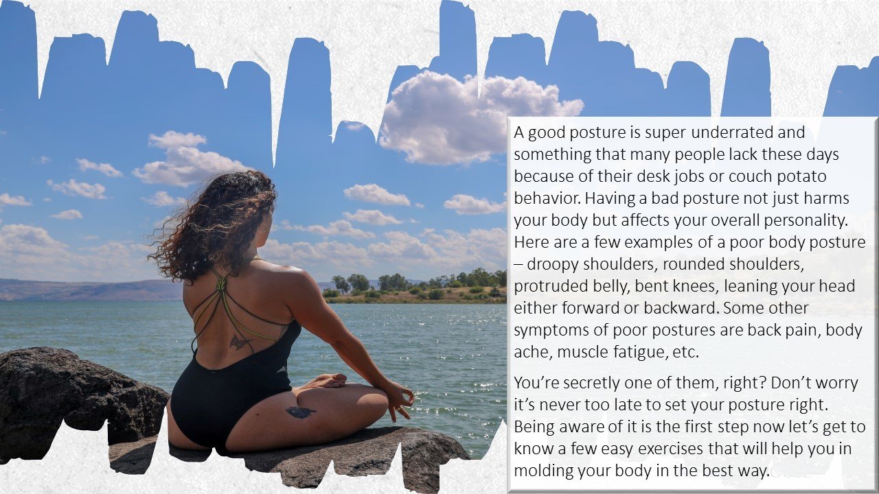 A good Yoga posture is super underrated and something that many people lack these days because of their desk jobs or couch potato behavior. Having a bad posture not just harms your body but affects your overall personality. Here are a few examples of a poor body posture – droopy shoulders, rounded shoulders, protruded belly, bent knees, leaning your head either forward or backward. Some other symptoms of poor postures are back pain, body ache, muscle fatigue, etc. You’re secretly one of them, right? Don’t worry it’s never too late to set your posture right. Being aware of it is the first step now let’s get to know a few easy exercises that will help you in molding your body in the best way.
