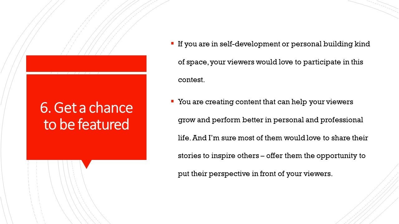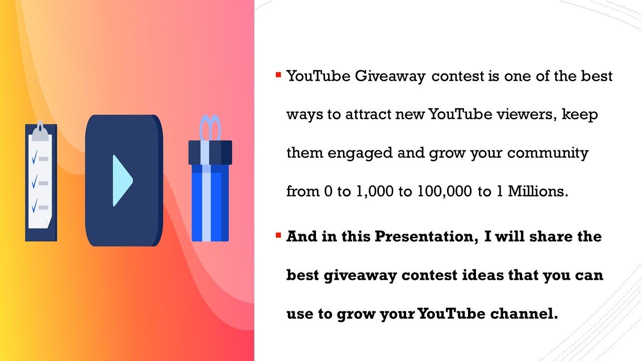 YouTube Giveaway contest is one of the best ways to attract new YouTube viewers, keep them engaged and grow your community from 0 to 1,000 to 100,000 to 1 Millions. And in this Presentation, I will share the best giveaway contest ideas that you can use to grow your YouTube channel.