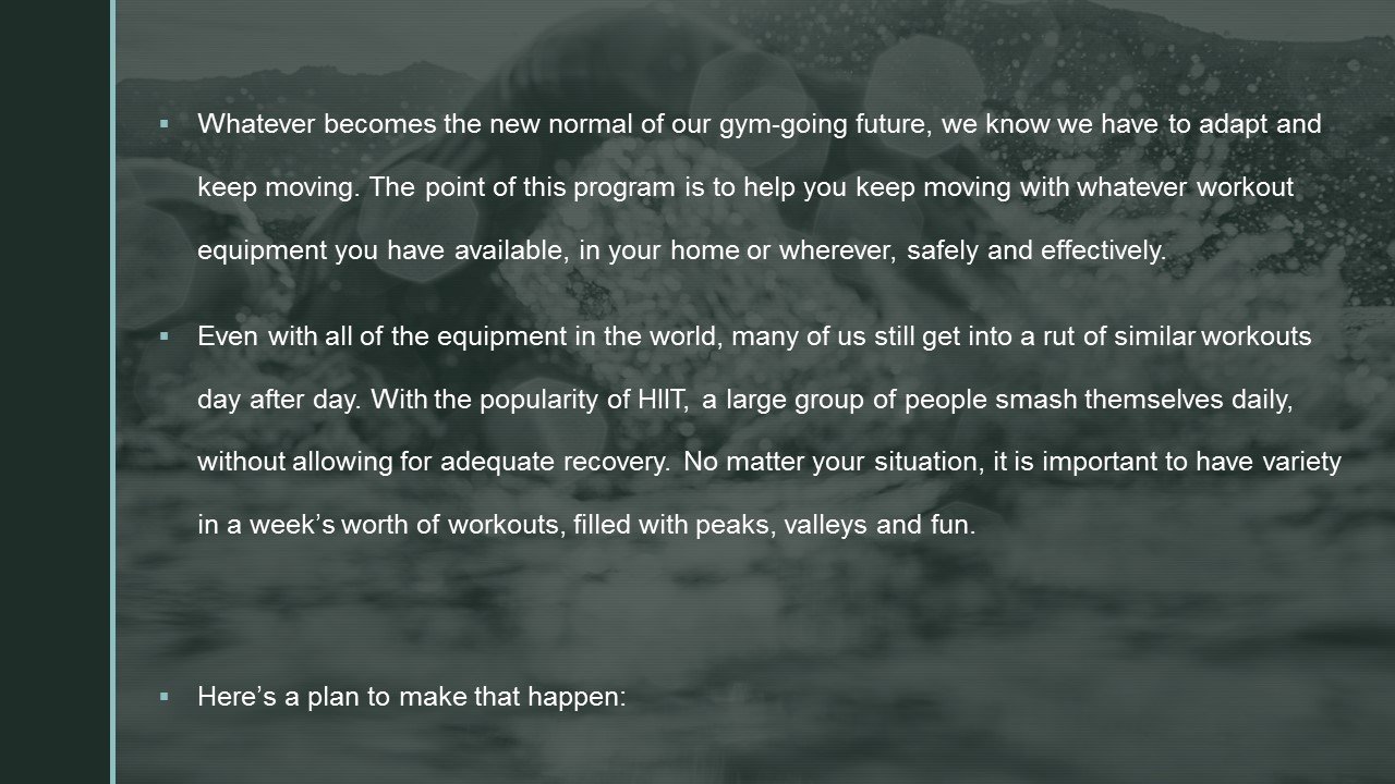 Whatever becomes the new normal of our gym-going future, we know we have to adapt and keep moving. The point of this program is to help you keep moving with whatever workout equipment you have available, in your home or wherever, safely and effectively.