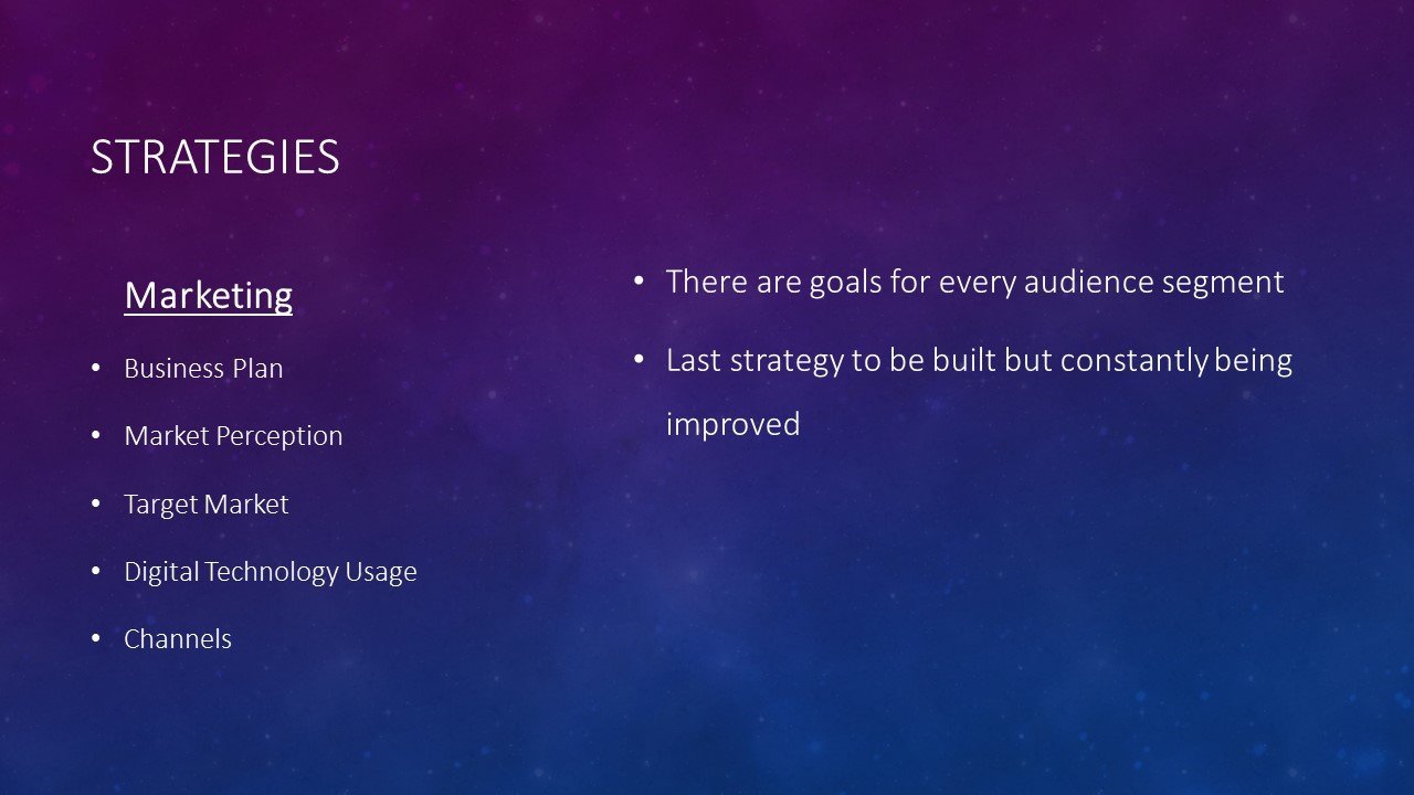 There are goals for every audience segment Last strategy to be built but constantly being improved