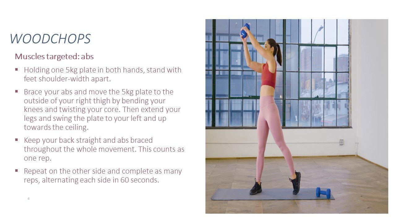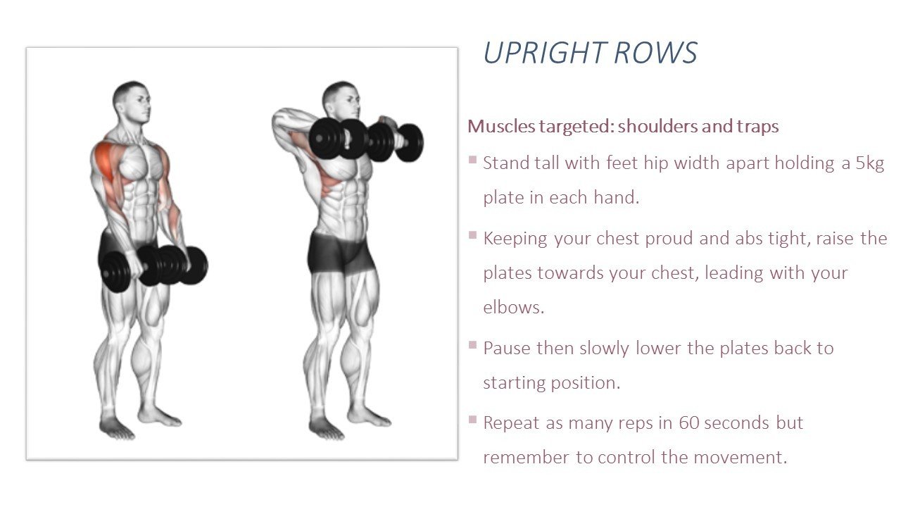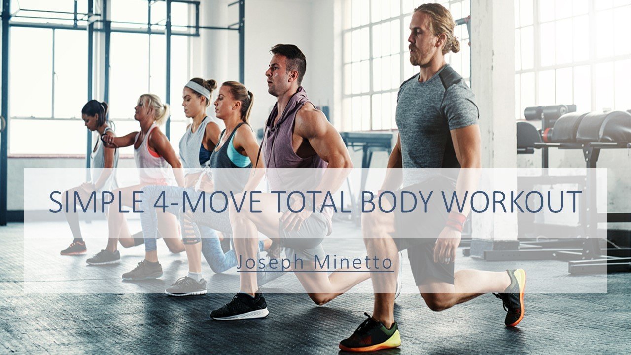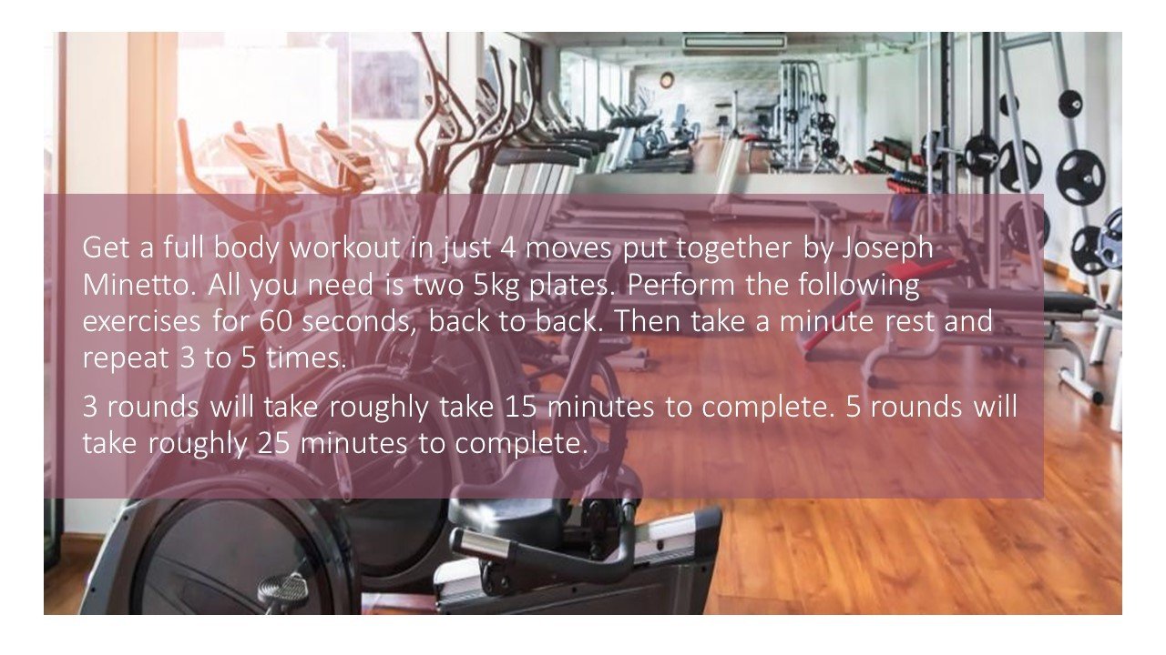 Get a full body workout in just 4 moves put together by Joseph Minetto. All you need is two 5kg plates. Perform the following exercises for 60 seconds, back to back. Then take a minute rest and repeat 3 to 5 times. 3 rounds will take roughly take 15 minutes to complete. 5 rounds will take roughly 25 minutes to complete.