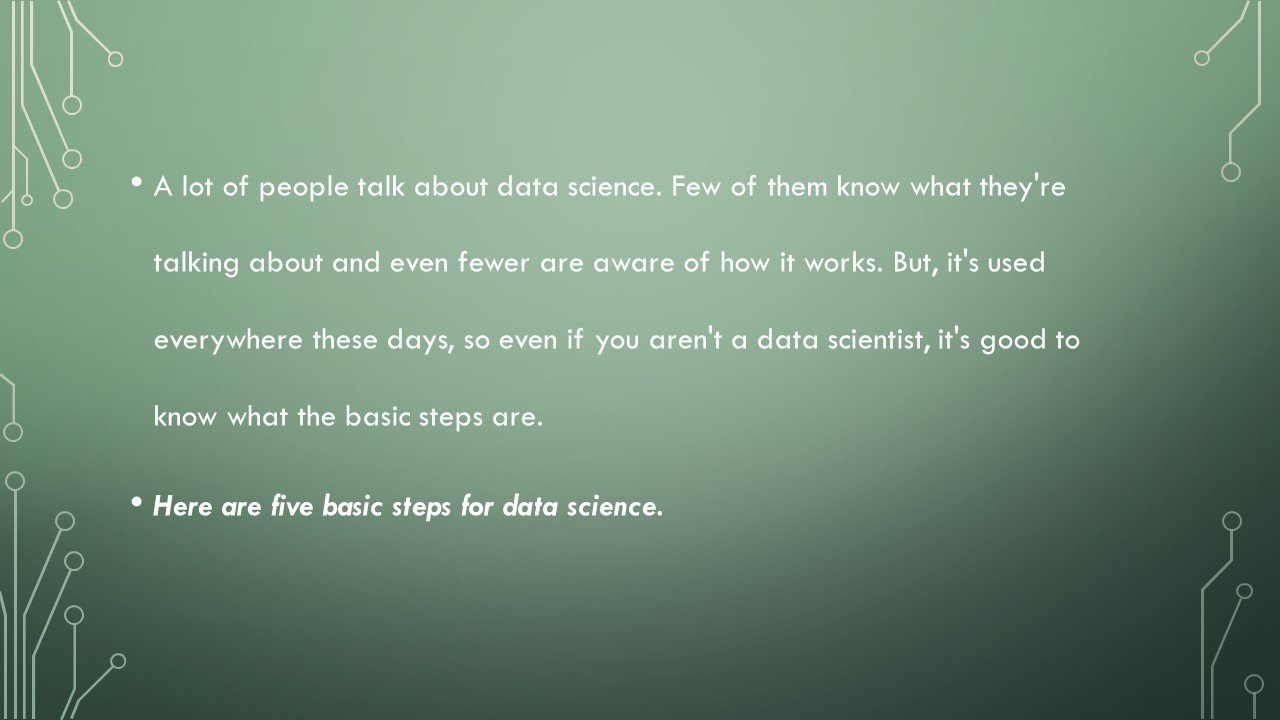 A lot of people talk about data science. Few of them know what they're talking about and even fewer are aware of how it works. But, it's used everywhere these days, so even if you aren't a data scientist, it's good to know what the basic steps are. Here are five basic steps for data science.