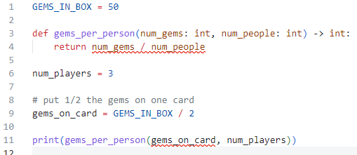 print(gems_per_person(gems_on_card, num_players))Python doesn't care if you follow the type hints....