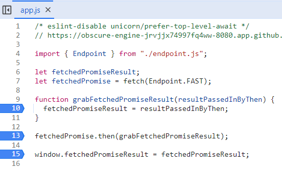 window.fetchedPromise = fetchedPromise;And let's also name our variable a bit more expressively to keep things very clear what we're dealing with.