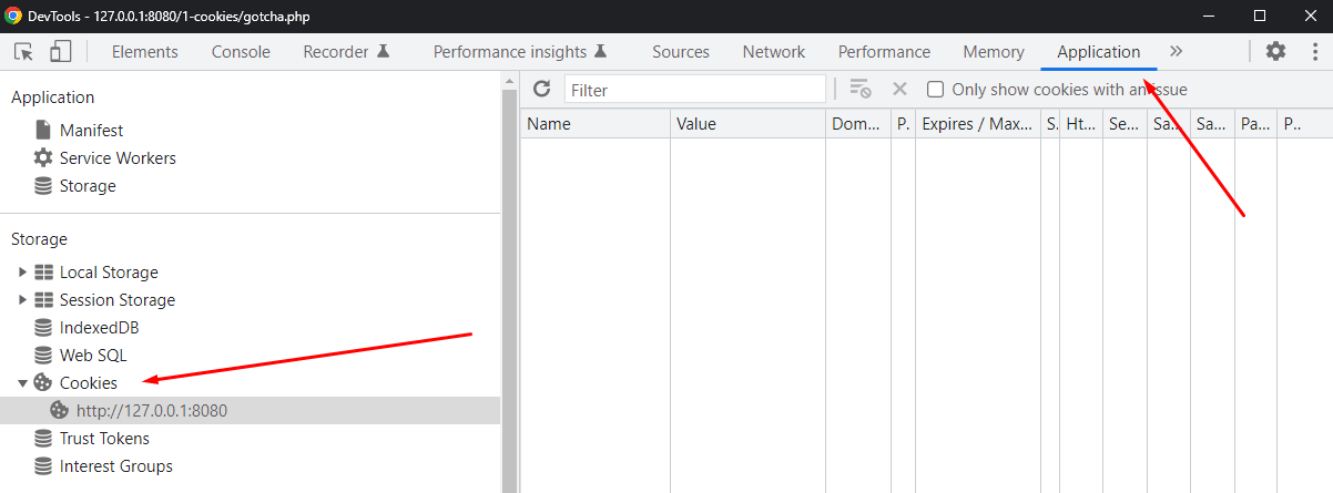 - We can see cookies using our browser tools (for example, in the Application tab in Chrome & Edge and Storage in Firefox).