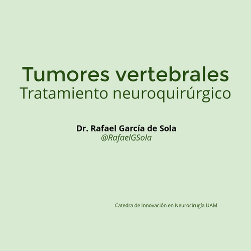 Los tumores vertebrales son lesiones que afectan a las estructuras óseas de la columna vertebral y pueden ser primarios o metastásicos. Los primarios son menos frecuentes y se originan en el propio hueso o en los tejidos adyacentes (como el mieloma o los condrosarcomas), mientras que los metastásicos proceden de otros órganos —principalmente pulmón, mama, próstata o riñón— y constituyen la mayoría de los casos. Estas lesiones pueden producir dolor localizado, que suele aumentar progresivamente y no cede con el reposo, y síntomas neurológicos derivados de la compresión medular o radicular, tales como pérdida de fuerza, alteraciones sensitivas o dificultades en la marcha. El tratamiento depende del tipo de lesión, su extensión y el estado del paciente. En casos metastásicos, el objetivo principal es paliar el dolor y preservar la función neurológica, combinando cirugía descompresiva, estabilización mediante instrumentación vertebral y tratamientos adyuvantes como radioterapia o quimioterapia. En los tumores primarios, especialmente los benignos o de bajo grado, se intenta la resección completa, recurriendo a técnicas de cirugía mínimamente invasiva y neuronavegación 3D, que aumentan la precisión y reducen las complicaciones.