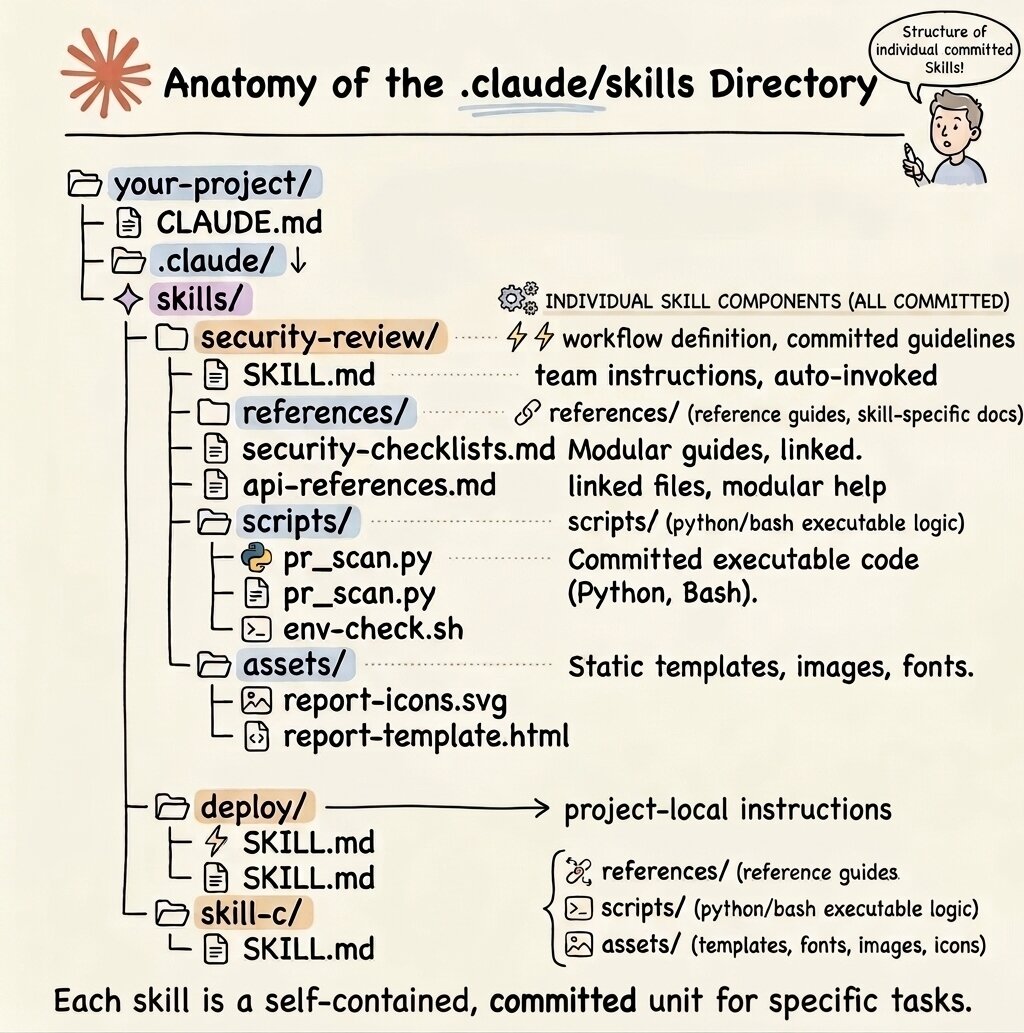 Un skill es esencialmente una carpeta con un archivo SKILL.md que contiene metadatos e instrucciones estructuradas, más recursos opcionales.